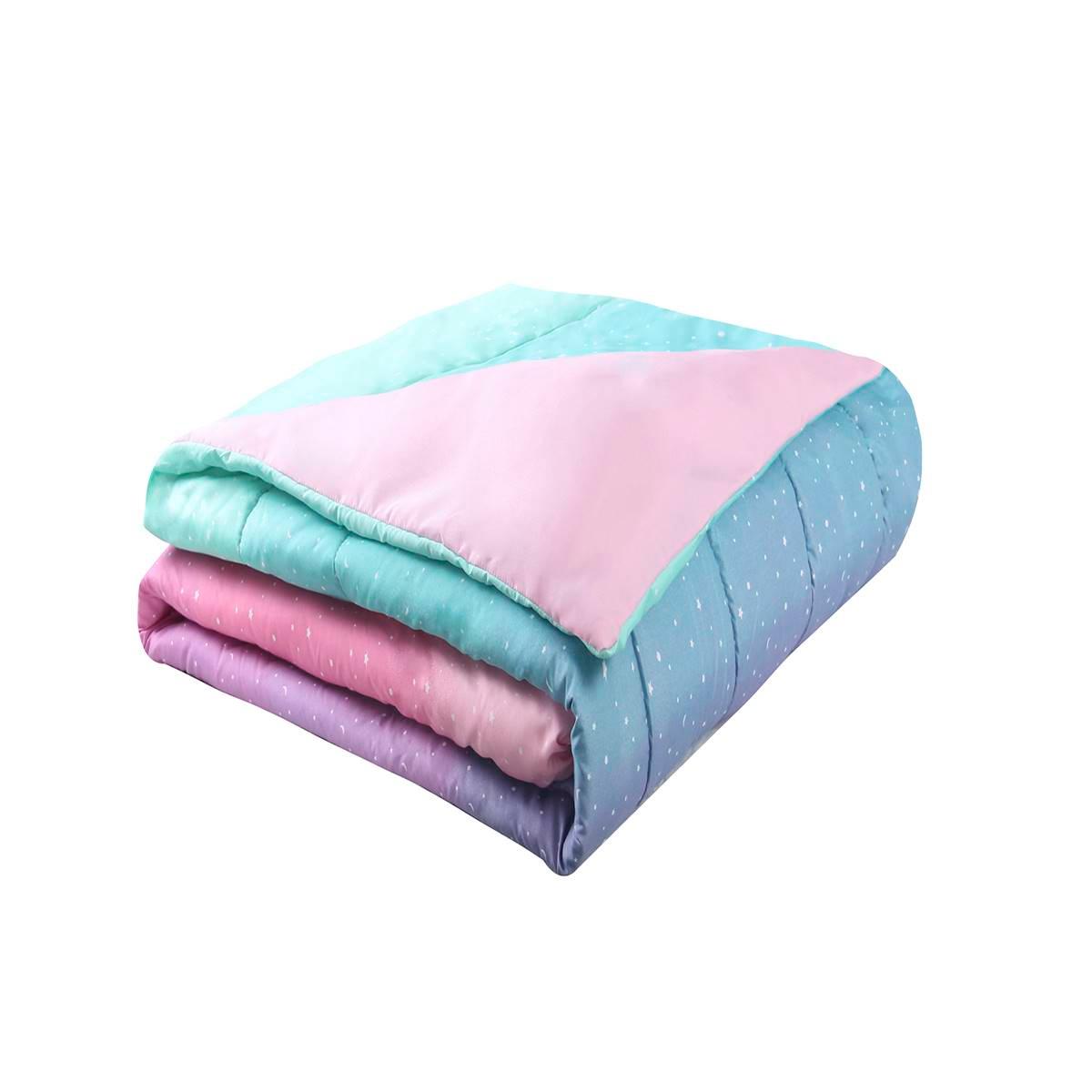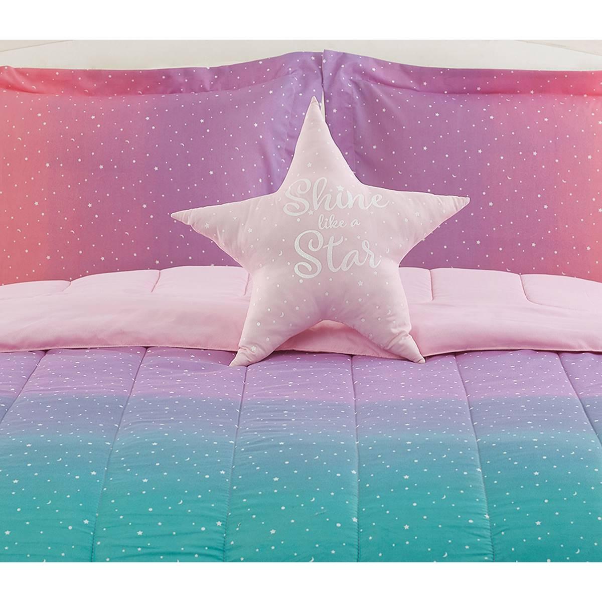 A beautiful ombre of color and tiny stars and moons decorates this Alex & Bella Jada Celestial Ombre Microfiber Comforter Set. It features pink, purple, aqua, and mint. A "Shine like a Star" glitter printed typography-shaped star pillow is included with the set.
