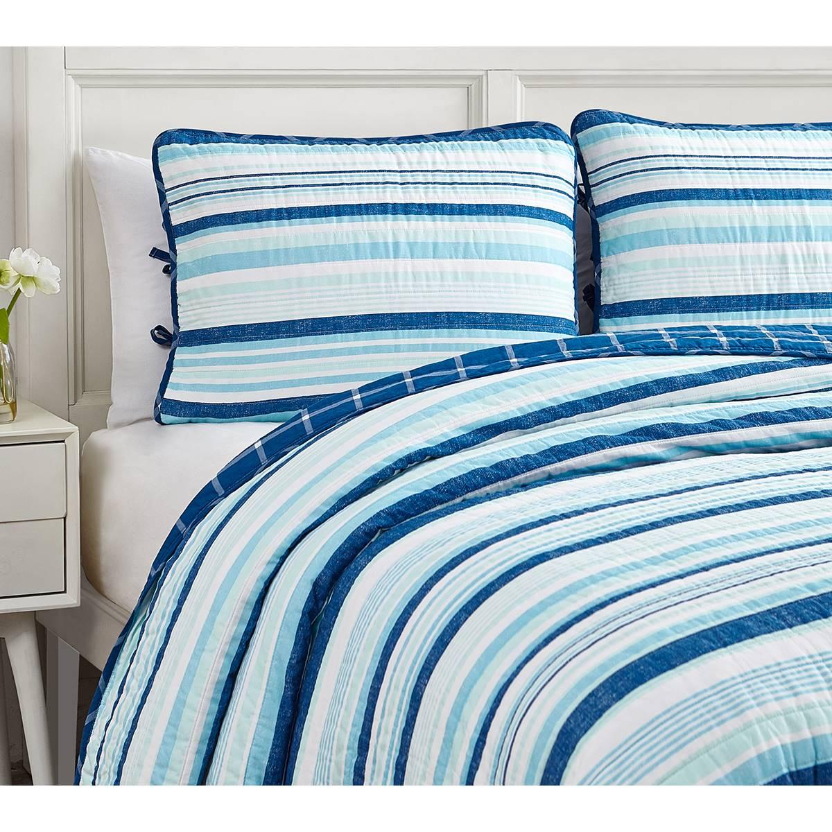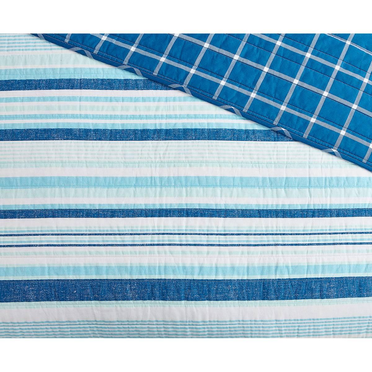 The Home Retreat Newport Stripe Reversible Quilt Set offers a fresh color palette and durable quality cotton fabric to update your bedroom. It features vibrant spa aqua, blue and navy variegated stripes and reverses to a navy and white check plaid pattern. Decorative highlighted along the sides of the shams, for an extra touch of style.