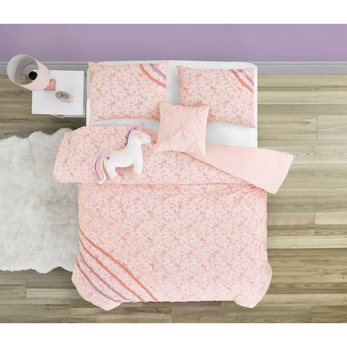 Makeover any bedroom with this Alex & Bella Rainbow Ruffle Microfiber Comforter Bedding Set. The comforter and shams are made of a floral unicorn print with colored scalloped ruffles in a rainbow shape. Two fancy decorative pillows are included to complete the look- one shaped plush unicorn and a pale pink pintuck square pillow.