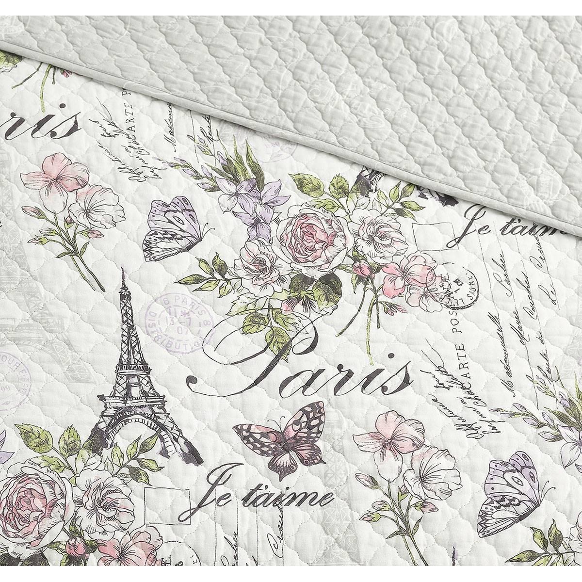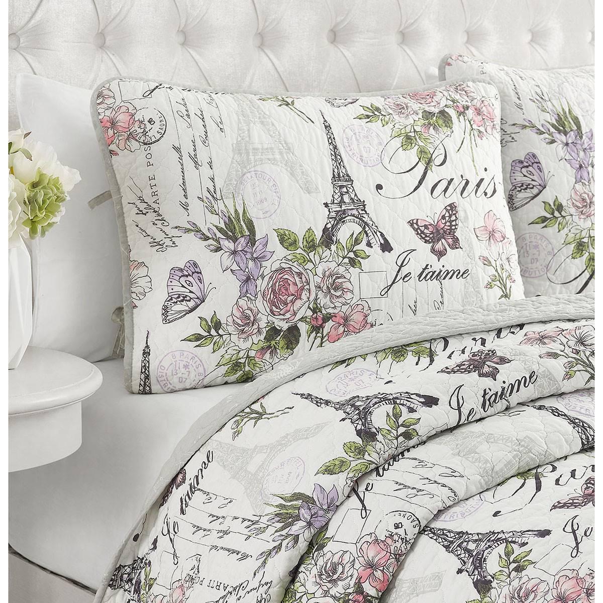 Create a romantic retreat in any bedroom with this Cedar Court Paris Floral Quilt Bedding Set. Travel to the city of lights with Eiffel towers, roses, botanical leaves, postcards, and script French sayings decorating this set. The shams feature tie closures for a decorative touch and to keep your pillow stuffer in place. This set is prewashed for added softness, which also adds a natural puckered and textured look.