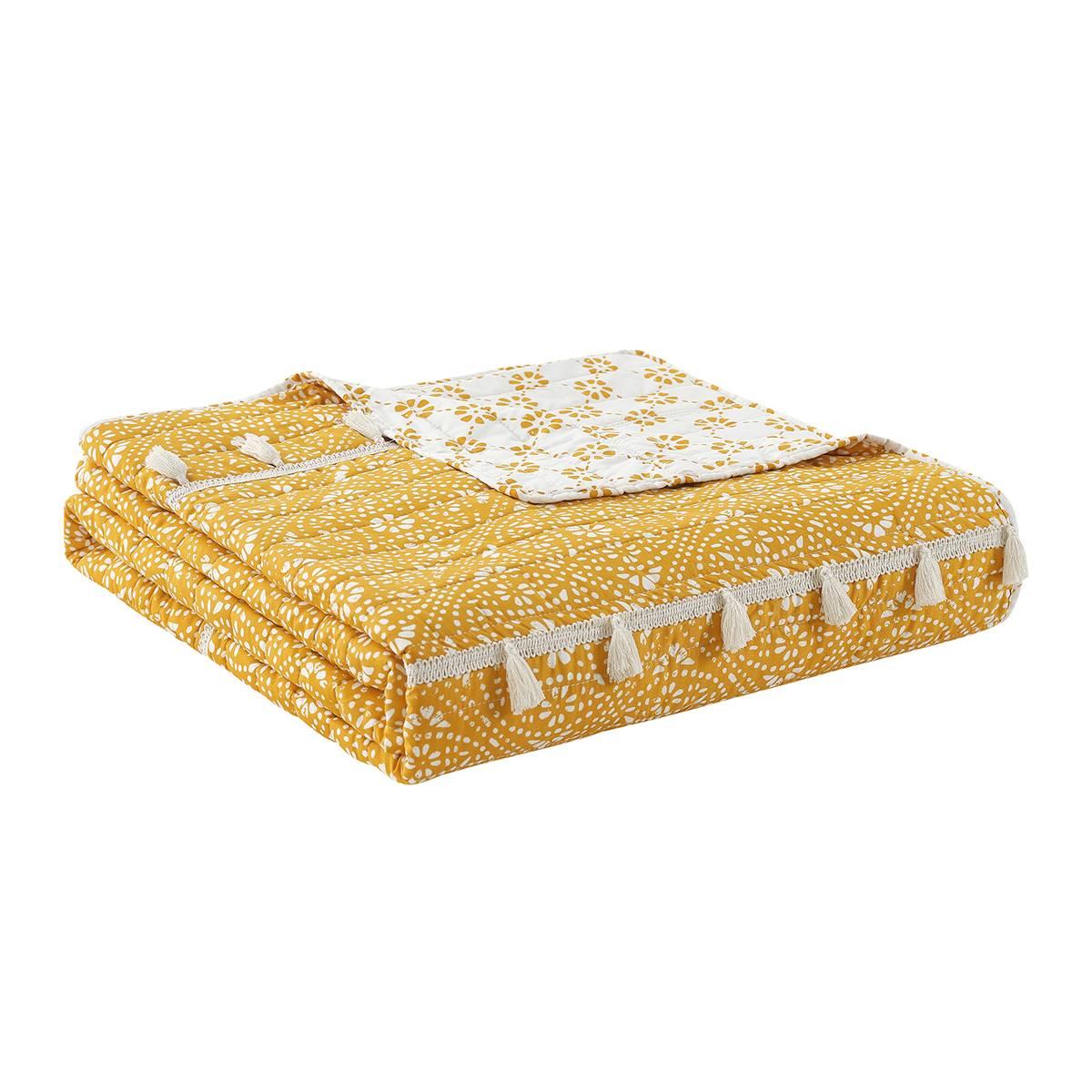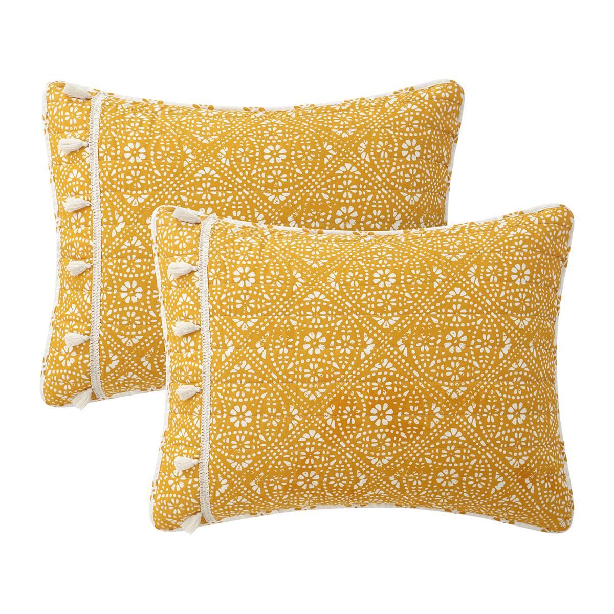 This Design Studio Pasadena Medallion Quilt Bedding Set will bring a fresh, bohemian look to any bedroom décor. It reverses to an ivory ground print with golden yellow flowers. This three-piece quilt set includes the quilt and two coordinating shams. All pieces are decorated with an ivory tassel trim and are quilted in a horizontal stitch design.