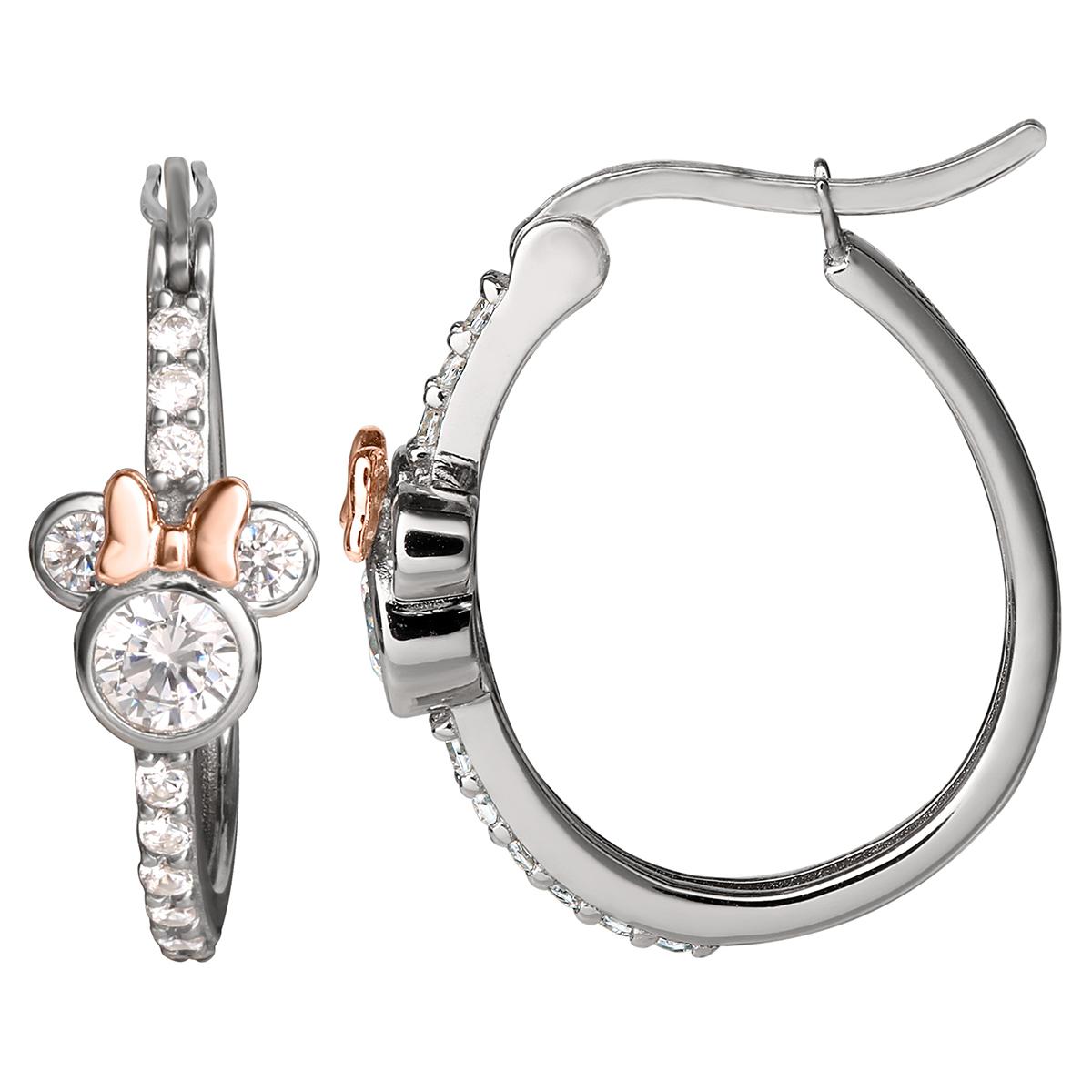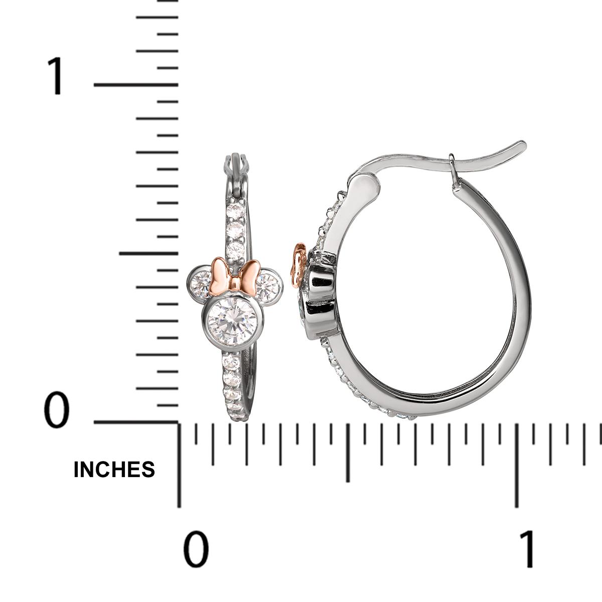 Take your love of Disney with you anywhere wearing these Splendere sterling silver, two-tone plated, and cubic zirconia Minnie Mouse oval hoop earrings.