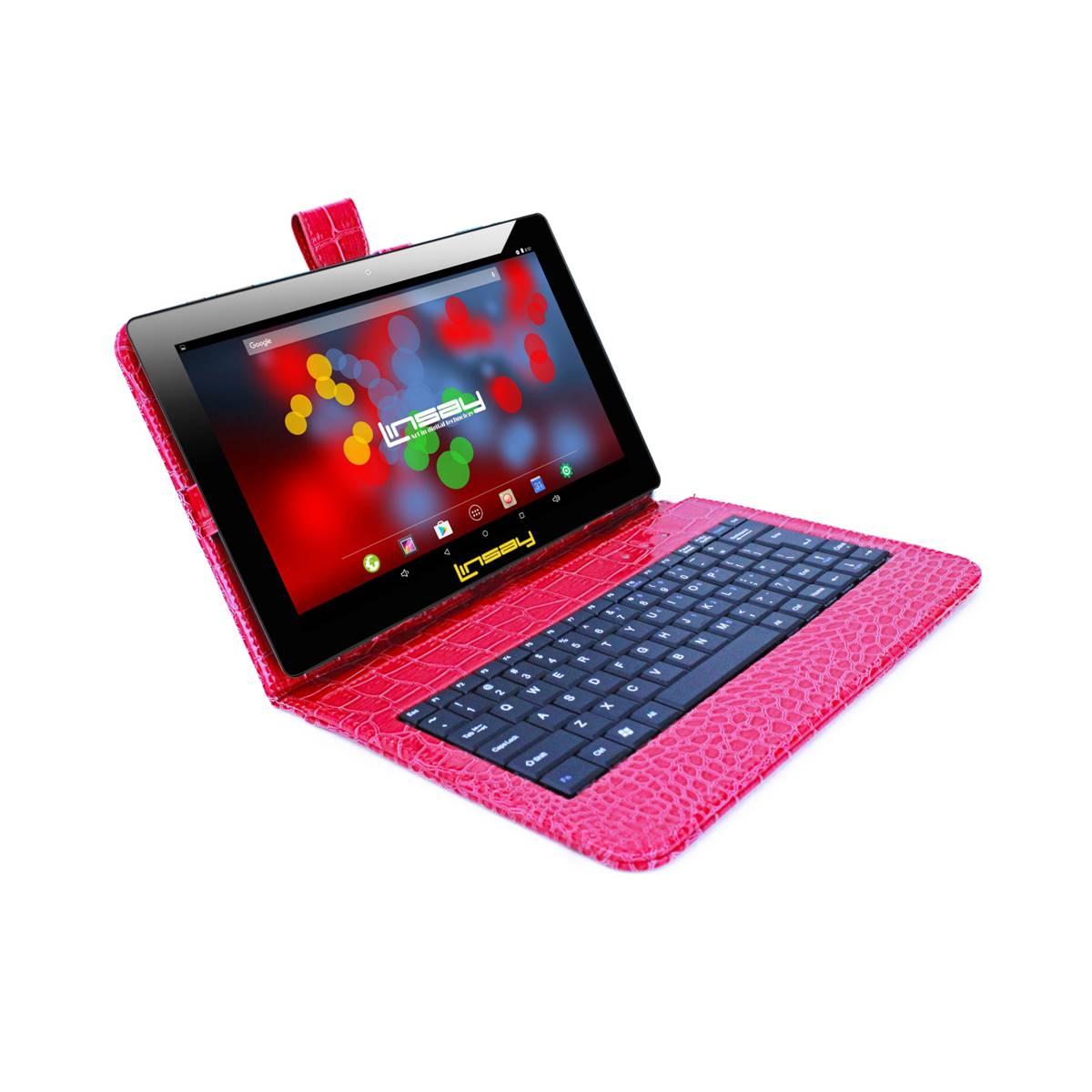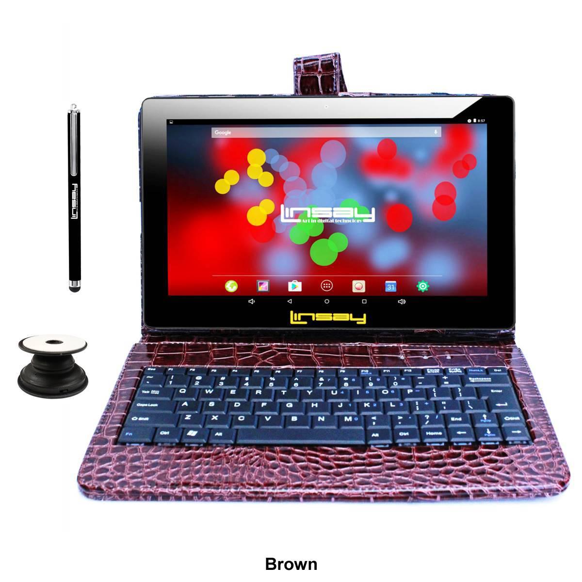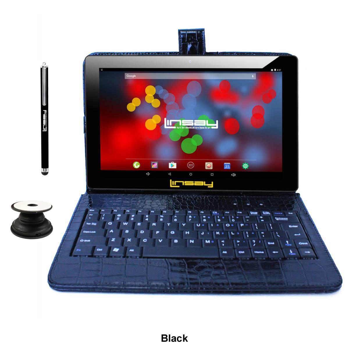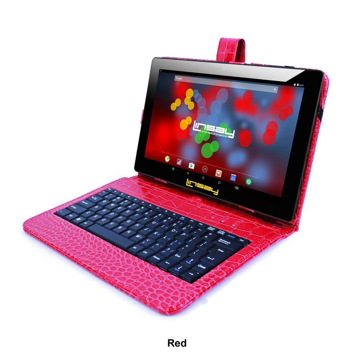 Description Stay connected with the easy-to-use Linsay Android 12 tablet with crocodile leather keyboard. Multi-task with the capacitive IPS 1280x800 touch screen and 32GB...