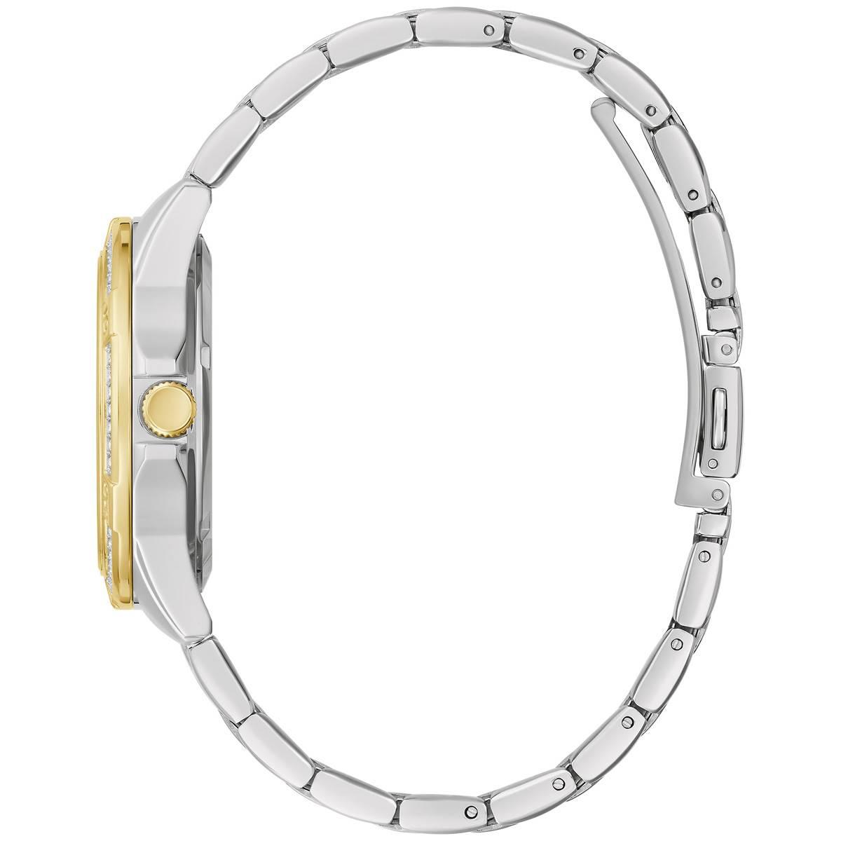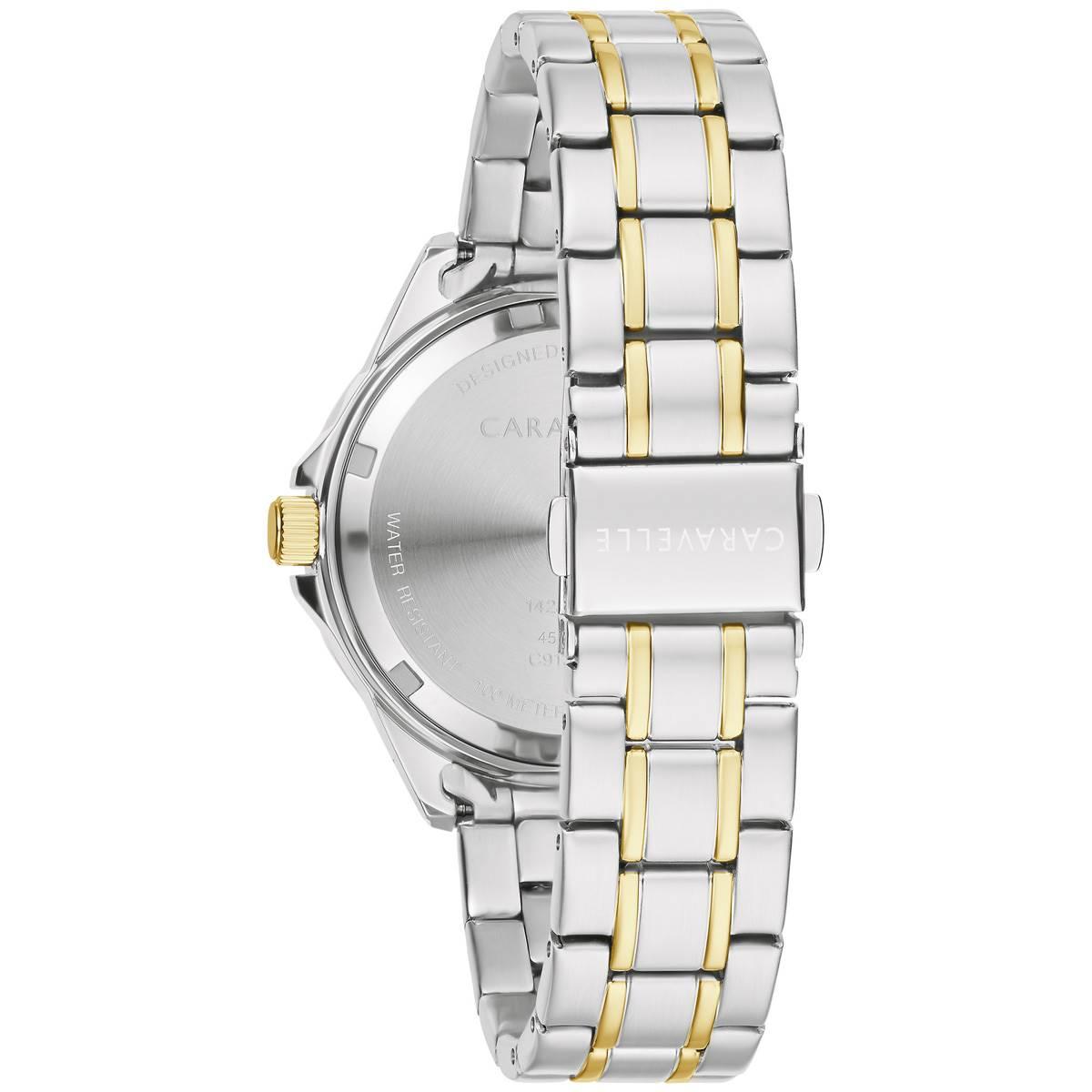 This Womens Caravelle Two-Tone Crystal Bezel Bracelet Watch will complete your outfit for a nice night out. Features a crystal dial with a date window and accented crystals. It is water-resistant up to 100 meters.Limited Manufacturer´s Warranty.