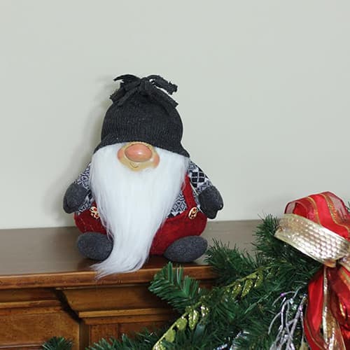 This Northlight Seasonal 9.5 inch red and charcoal grey Dan gnome can´t wait for the Christmas season to start! He is shown wearing a grey, black, and white patterned sweater with matching grey hat, gloves and shoes. His red pants are held up by matching suspenders. Dan’s bottom is weighted for stability.