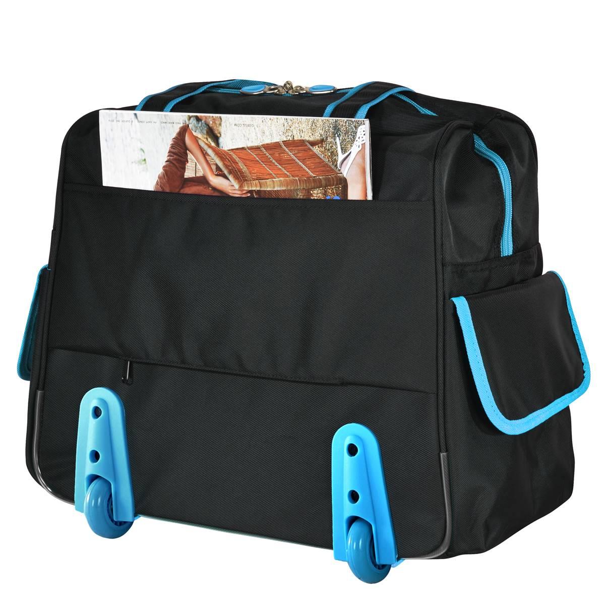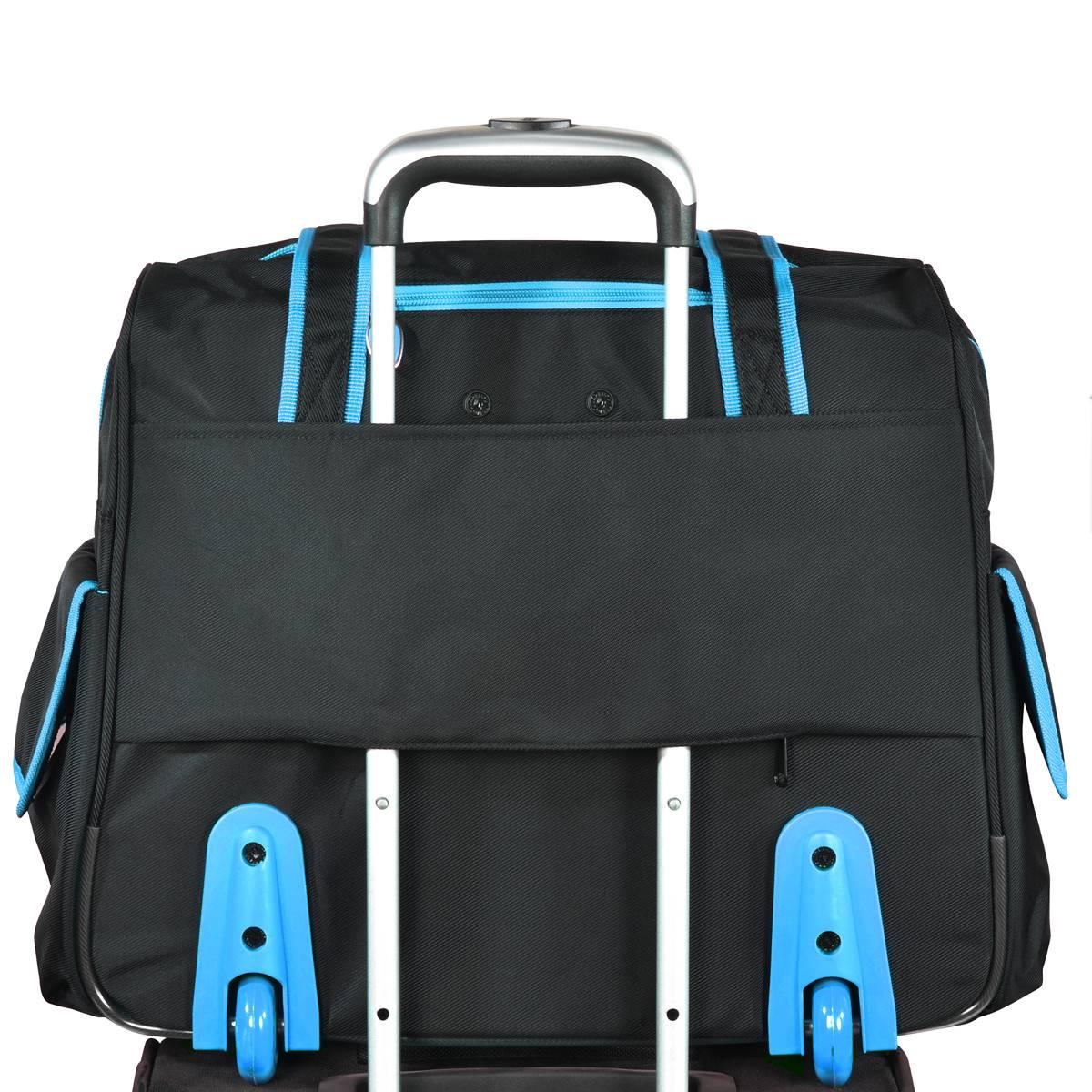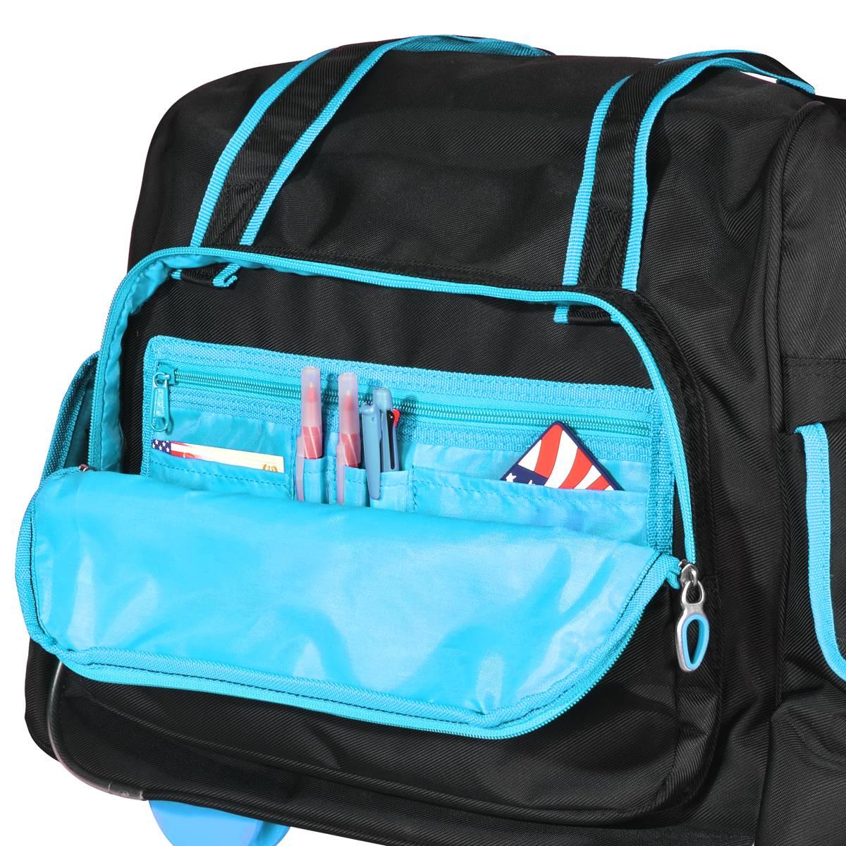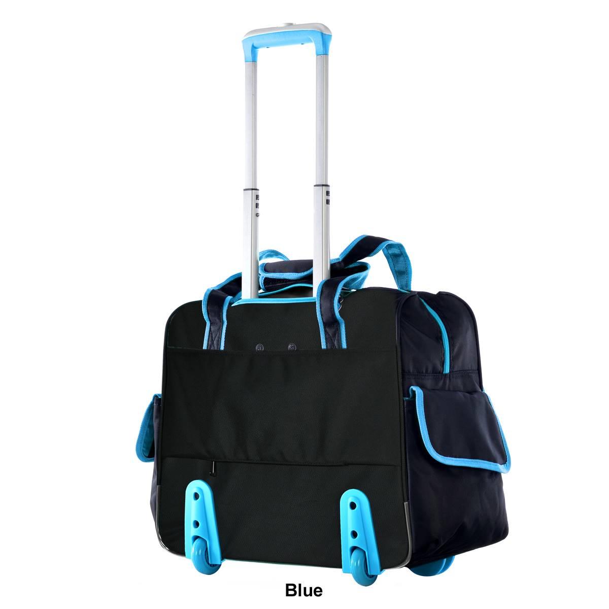 This Olympia USA Rave fashion rolling overnighter is perfect for traveling. It is constructed with jacquard polyester and recessed metal ball-bearing in-line skate wheels. It also has a heavily padded laptop compartment inside and multiple pockets on the front and side.