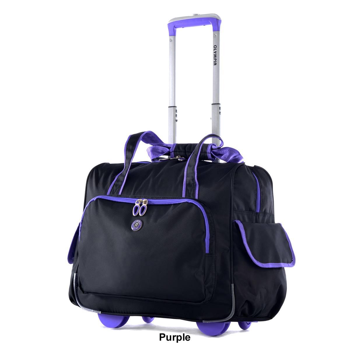 Description This Olympia USA Rave fashion rolling overnighter is perfect for traveling. It is constructed with jacquard polyester and recessed metal ball-bearing in-line skate...