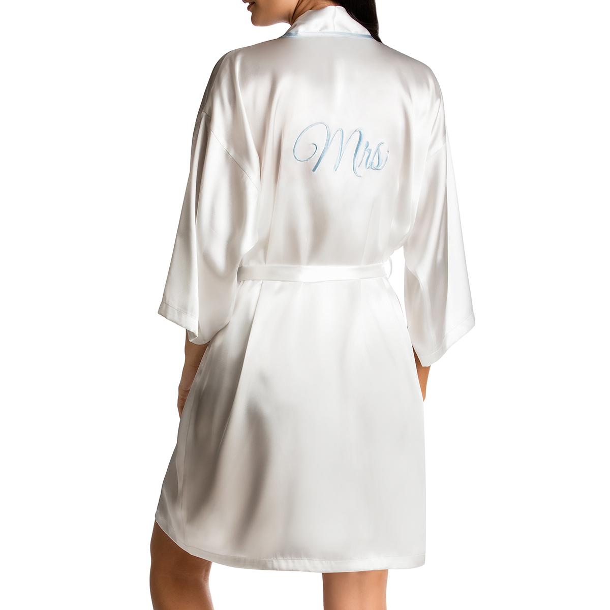 Description This pretty Womens Linea Donetella wrap chemise robe will have you feeling great on your special day. Features a self tie belt, lace detailing, and "Mrs" embroidered...