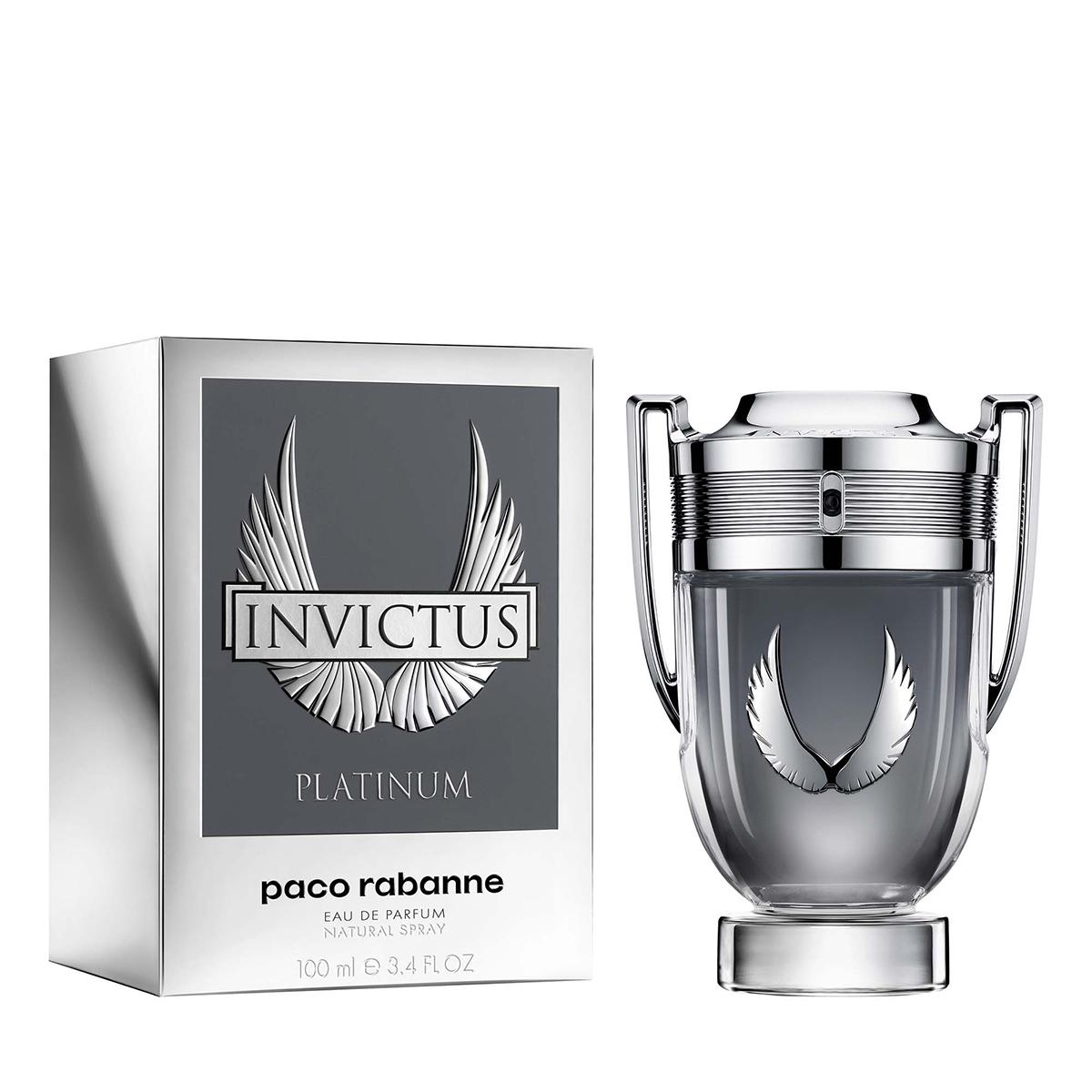 Rabanne Invictus Platinum Eau de Parfum. An intense power of minty freshness explodes with elegant lavender. An eau de parfum to galvanize the senses. Energy-made liquid. Invigorating grapefruit and absinth clash with richer and masculine notes of patchouli and cypress: a woody finish to bring strength and complexity. Discover a radical cocktail of pure power and elegance.Family: Aromatic Woody