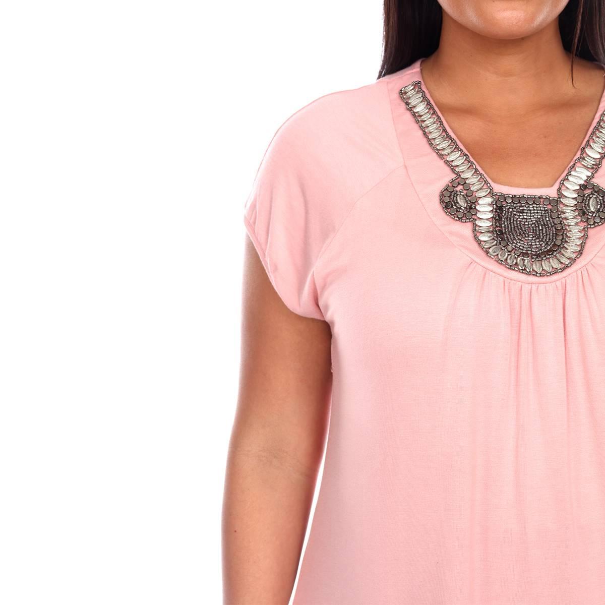 Add the right touch to your outfit with this Plus Size White Mark short sleeve fenella tunic. Glimmering embellishments decorate the fashionable v-neck neckline while the point side hem completes the silhouette.