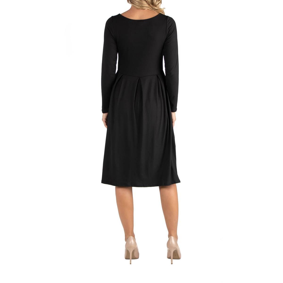 This Plus Size 24/7 Comfort Apparel maternity fit and flare midi dress is great for any occasion whether casual or dressy. Featuring a round neckline, long sleeves, midi length hemline, pleated waist, and pockets for a finishing touch. Pair this fit n flare dress with ballet flats for a casual look or create a dressy look with heels. Available in nine beautiful color options, you´ll want one in every color! Made from a soft and comfortable stretch material that is machine washable for easy care.