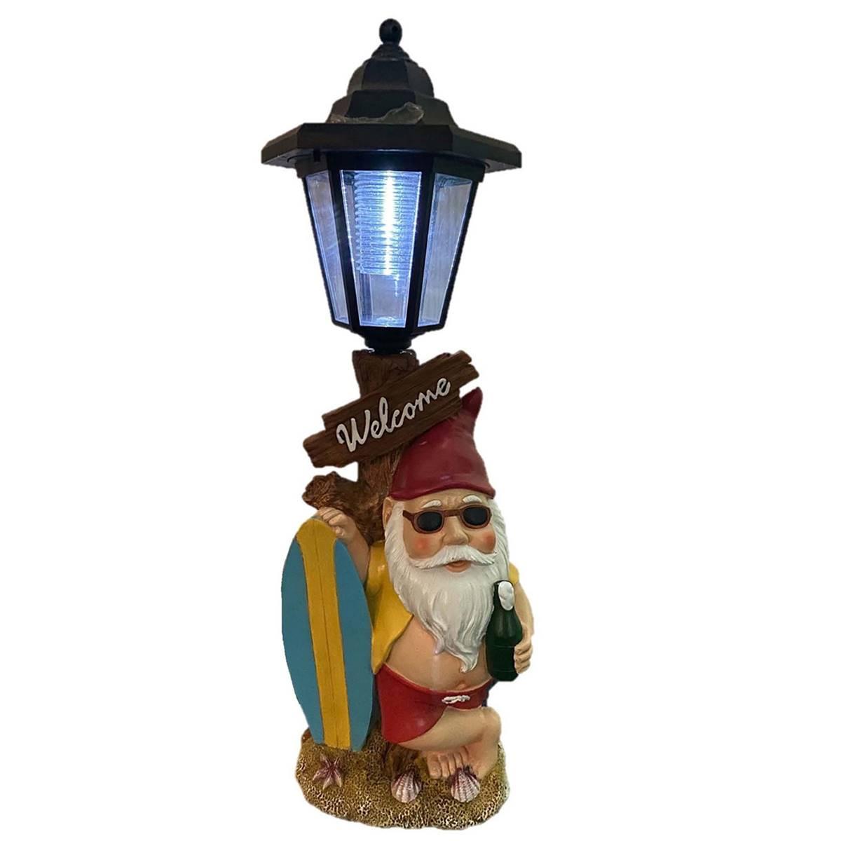 Welcome to the good life! This Santa´s Workshop 16-inch Solar Beach Welcome Gnome has his beach essentials already in hand: a board and a beverage. When night falls, he´s got it covered with his solar-powered light post that casts an inviting glow all around.