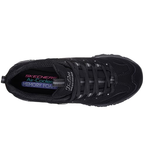 These Womens Skechers D´Lites Play On athletic sneakers feature a smooth trubuck leather and synthetic upper with stitching overlay accents. Wear this classic comfortable style all day with the Air Cooled Memory Foam insole, lightweight shock absorbing supportive midsole, and flexible rubber traction outsole.