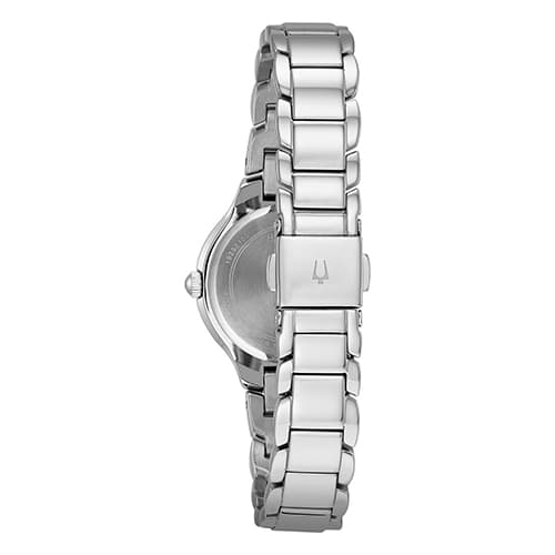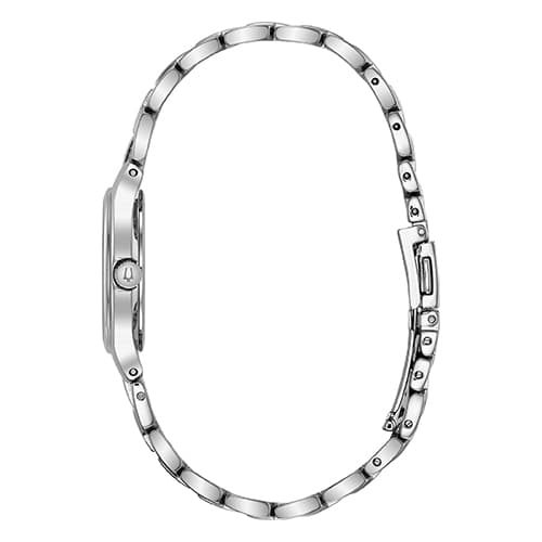 This Womens Bulova stainless steel and blue accent dial bracelet watch is a slim style with a stainless steel case, a silver-white dial and with blue hands and markers. Water resistant to 30 meters. To clean wipe with a soft dry cloth. Case Dimensions: 28mm x 7mm.Style 96L215.Limited Manufacturer´s Warranty.