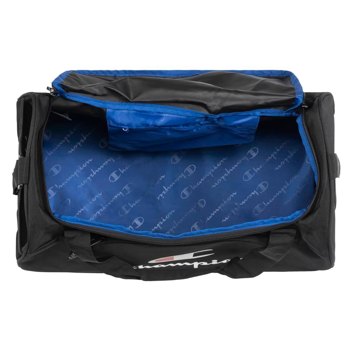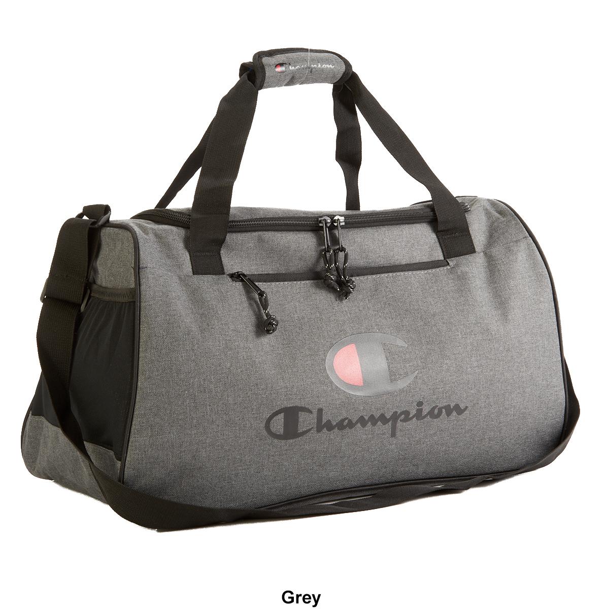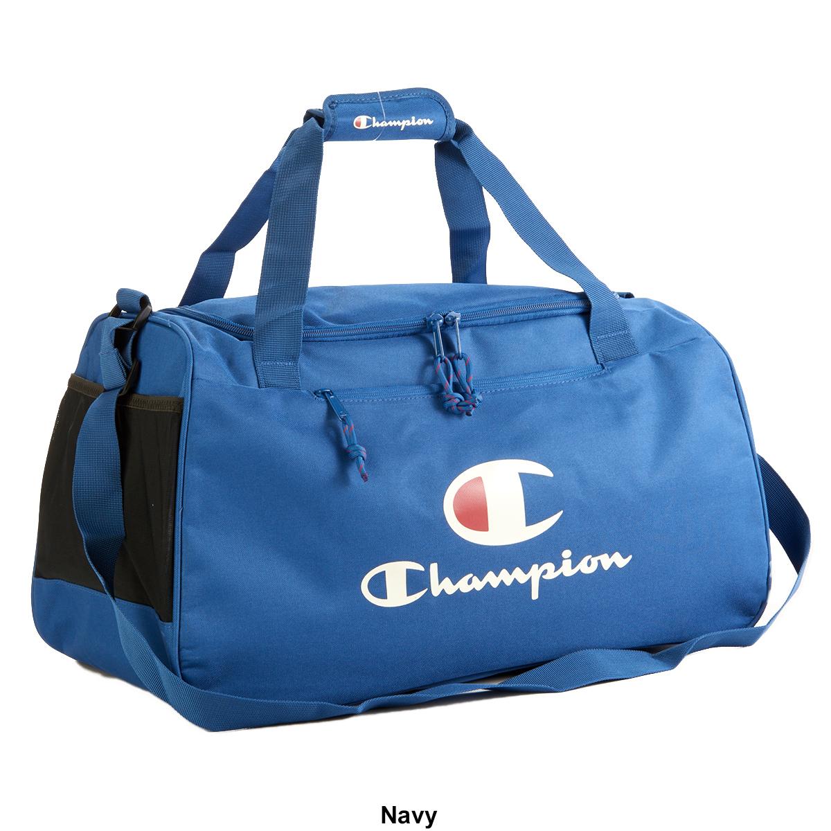 Description This Champion® progress duffel features an adjustable shoulder strap, webbing handles with velcro wrap, a front zip pocket, side mesh pockets, and an internal zip...