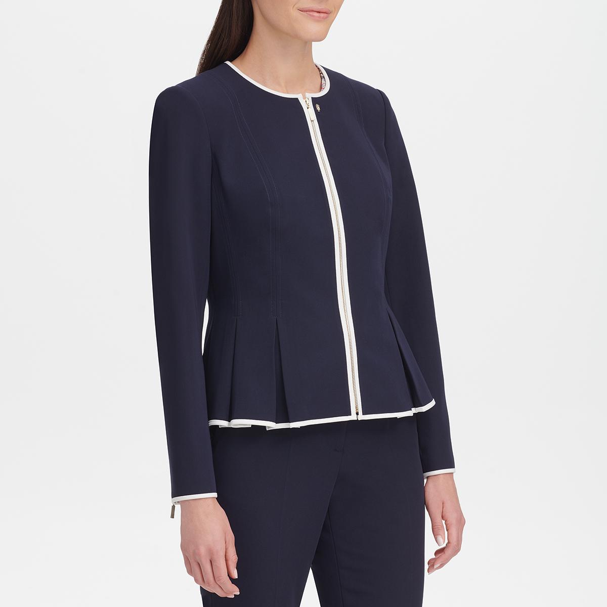 A flattering staple for career looks Womens Tommy Hilfiger piped zip front blazer showcases contrast trim and a stylish peplum hem .