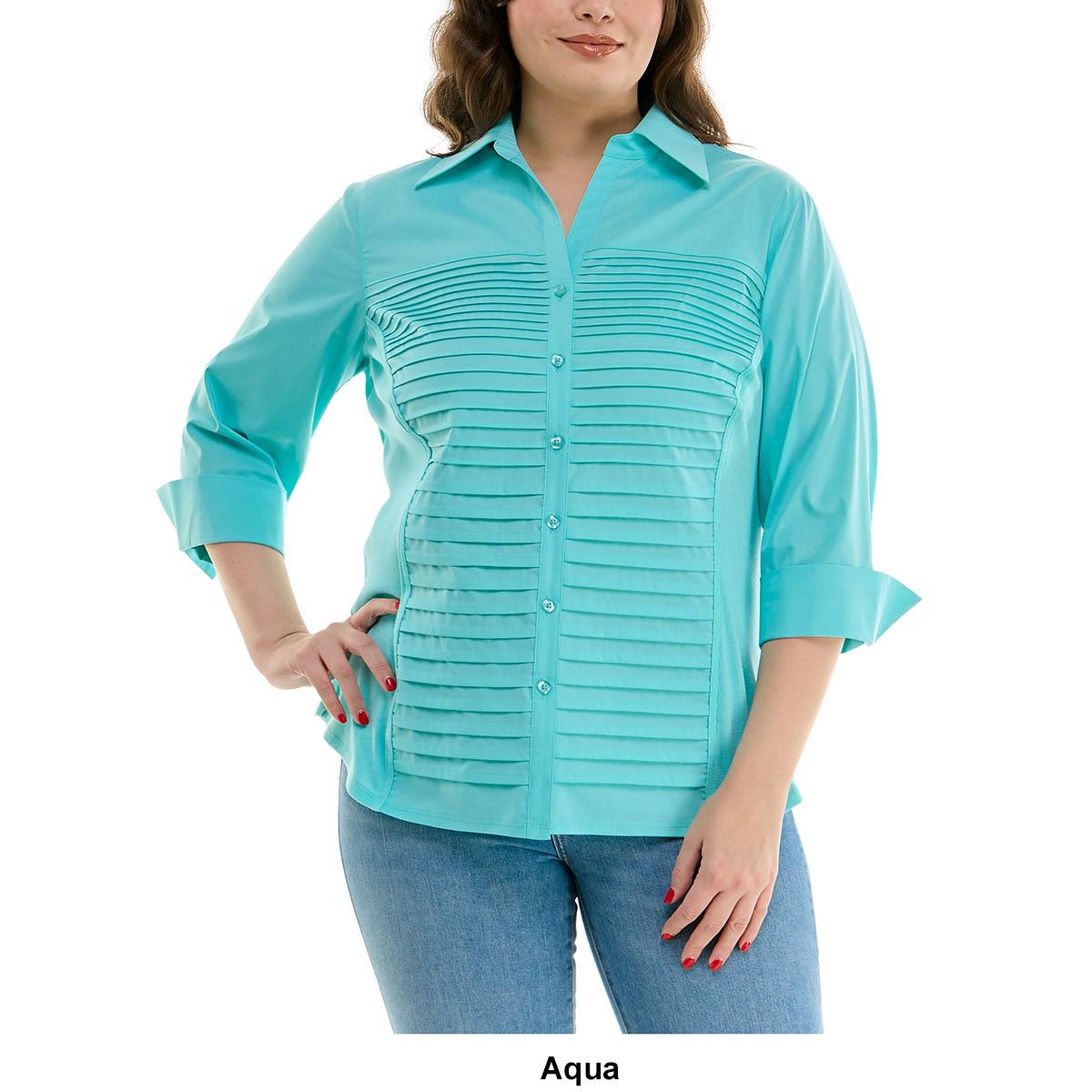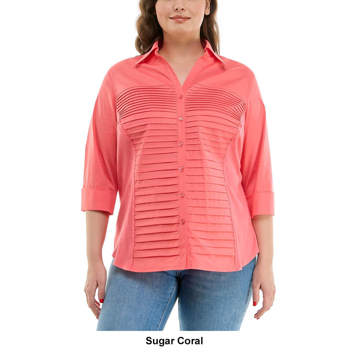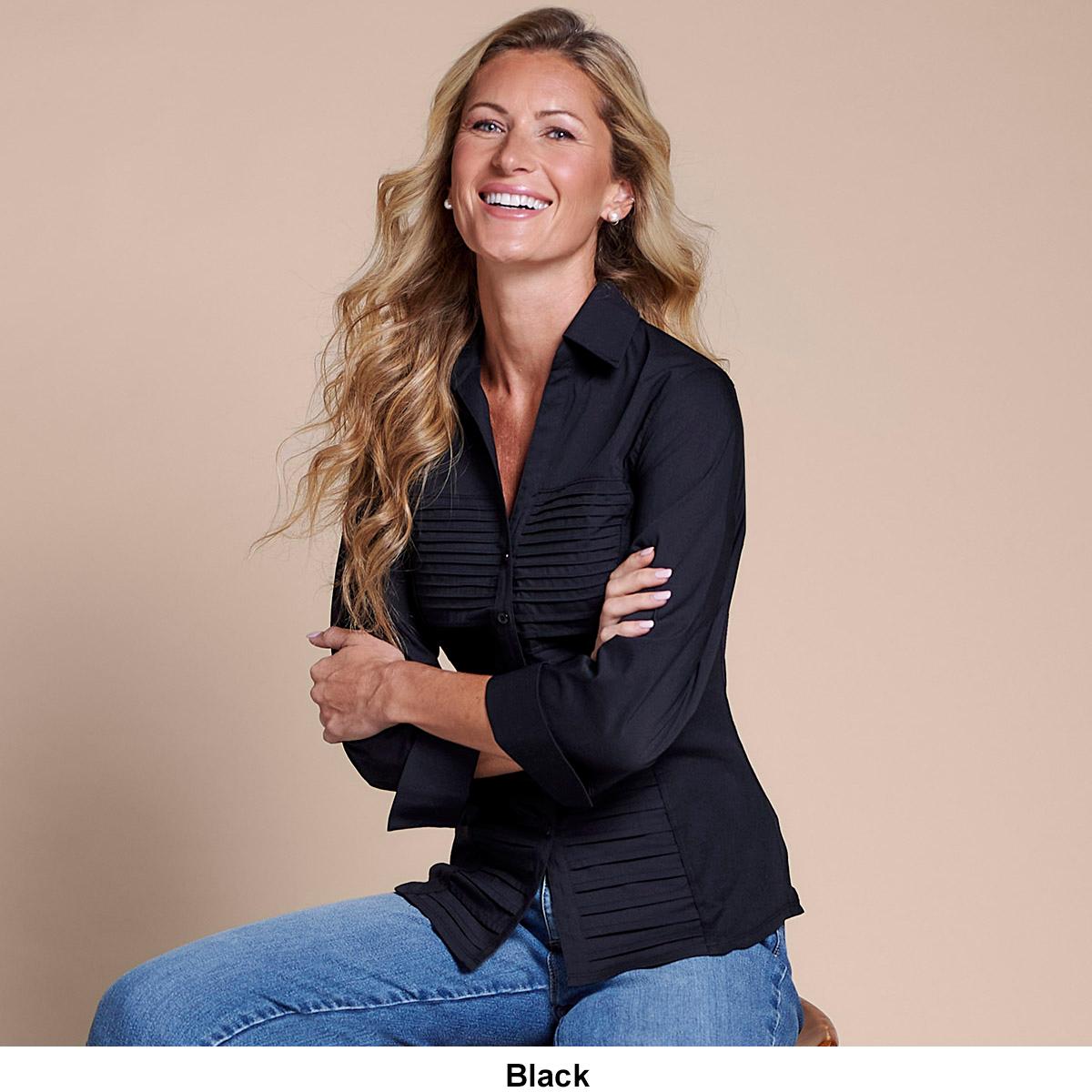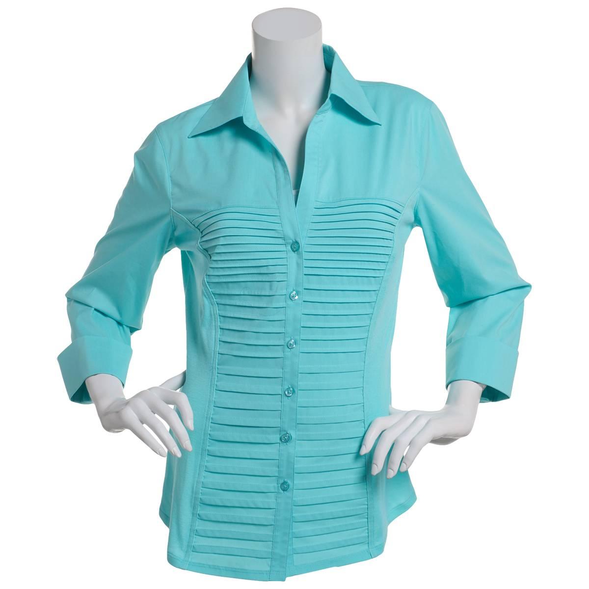 Description Pattern: SolidSleeve Length: 3/4 Sleeve Neck: Split NeckCollar: Spread Full button front closure Adjustable interlock sleevesRibbed insert details Pintuck accenting...