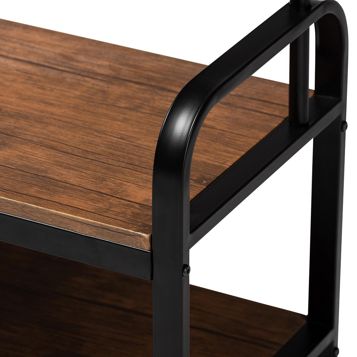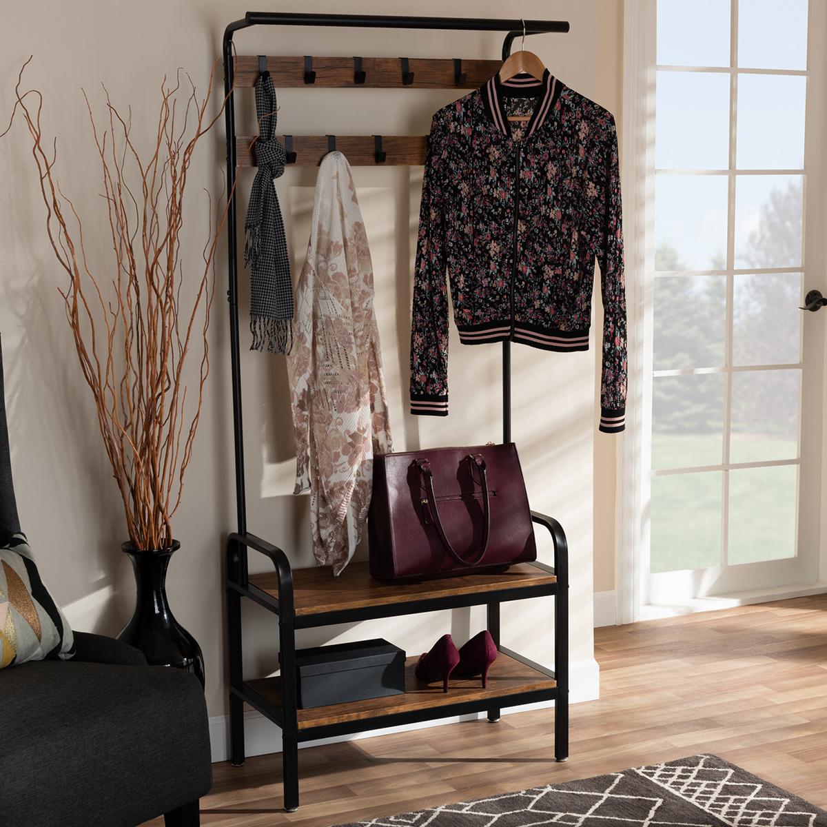 Add rustic style to your entryway with the Baxton Studio Aislin hall tree. This versatile piece combines seating and storage into one, making it an ideal option for optimizing your space. A durable black metal frame supports two shelves crafted from distressed wood. Hang coats and scarves on ten hooks or on the top bar. Store shoes and bags on two shelves, one of which can also be used as a bench for putting on shoes. Functional and stylish, the Aislin features a clean industrial design that will complement any space.