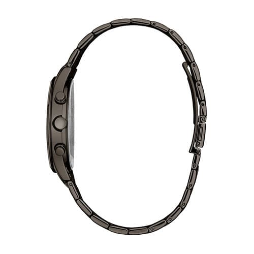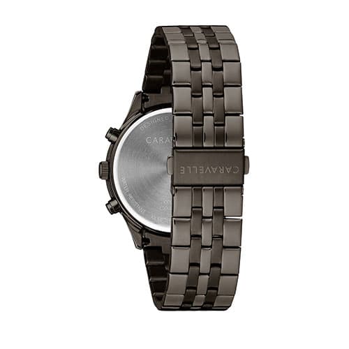 The Mens Caravelle gunmetal chronograph sports watch showcases a timeless design. It features a functional chronograph with a sleek gunmetal IP stainless steel case and bracelet and a contrasting against a grey dial. It is finished with a simple fold over buckle closure. This watch is also water resistant to 30 meters. Case dimensions: 41mm.Style 45A141.Limited Manufacturer´s Warranty.