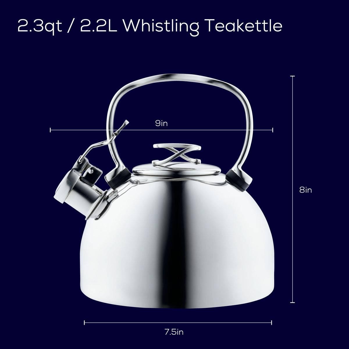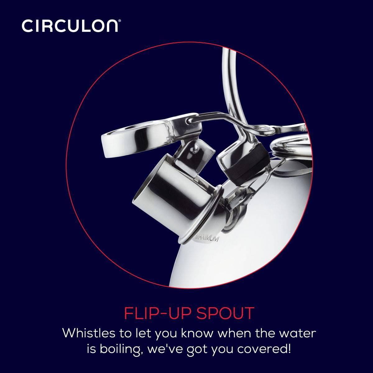 Description Brew piping hot, delicious teas, coffees, hot chocolate, and more with this Circulon® 2.3-quart Stainless Steel Whistling Teakettle. The flip-up spout pours safely...