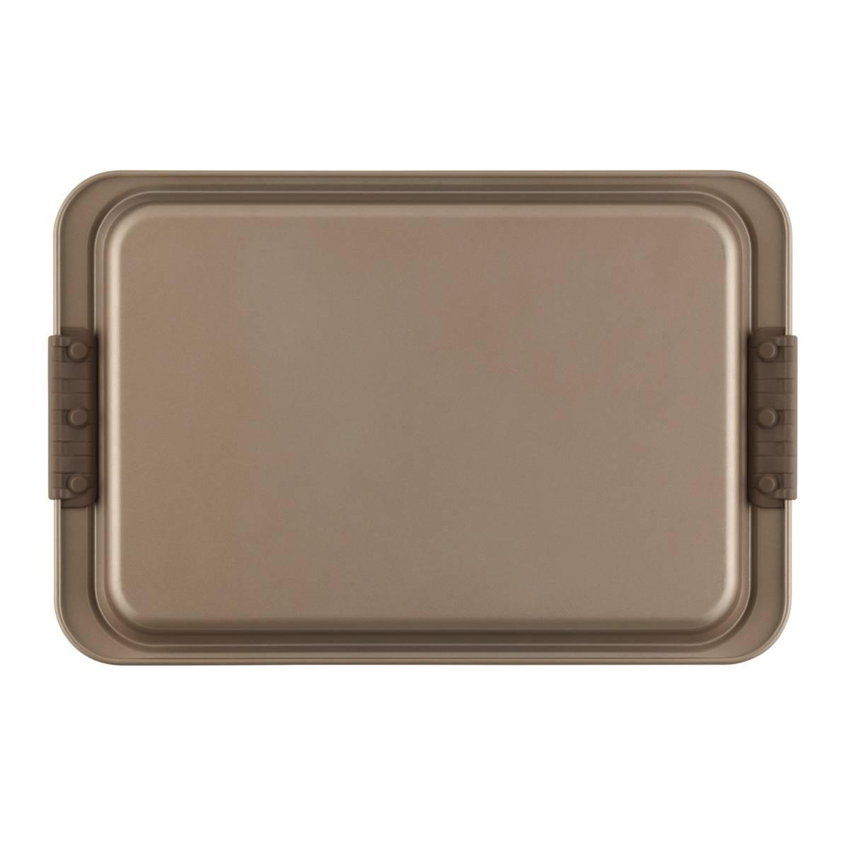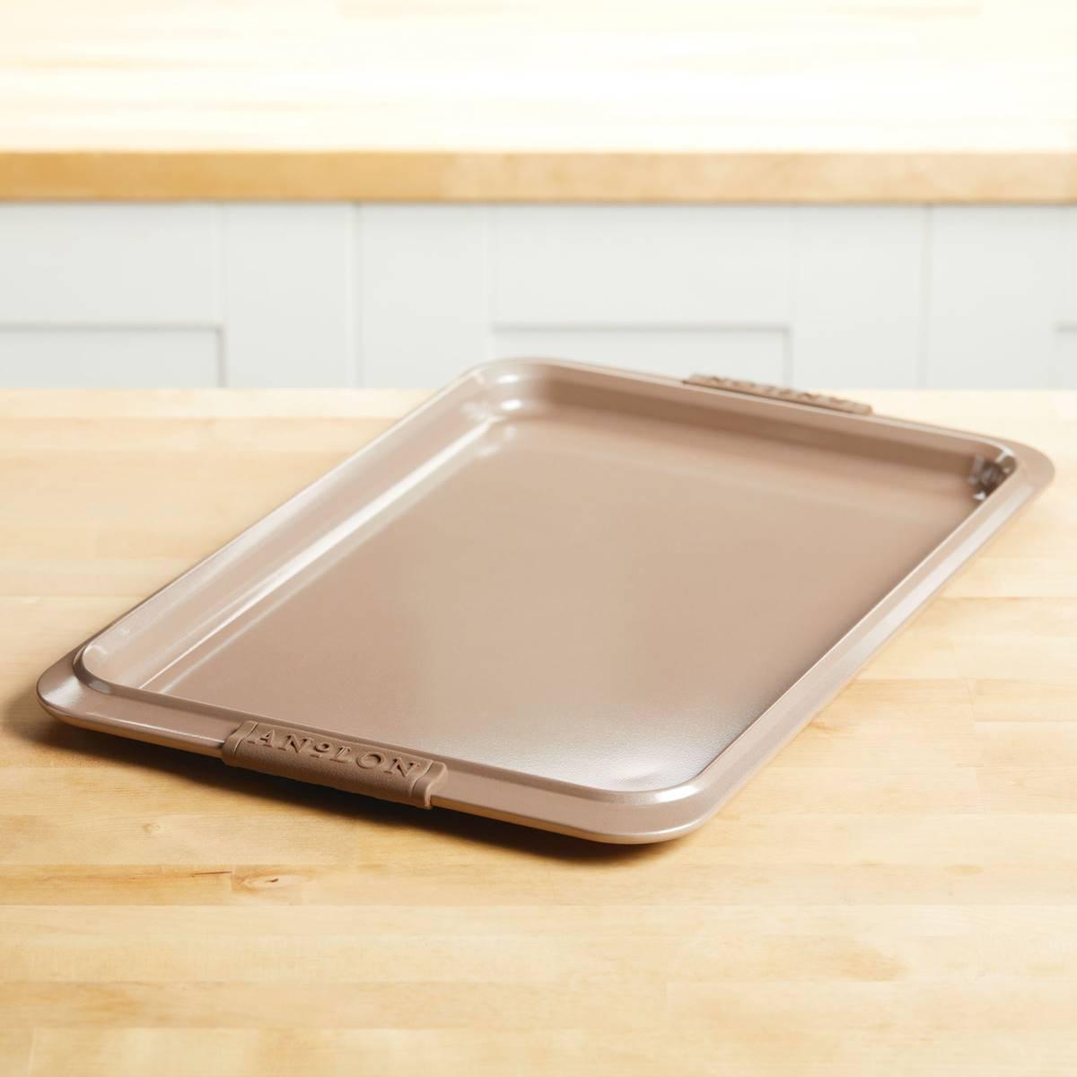 The Anolon® Advanced cookie pan features a larger surface for creating sizeable batches of baked treats. This pan features a convenient lip around the outside edge and resists warping while providing the even heat distribution that is critical for successful baking results. The medium color tone aids in even browning and the stylish bronze colored nonstick coating provides optimum food release. The wide rim and handles are fitted with silicone grips for a more confident hold and a comfortable grasp even with bulky oven mitts. Dishwasher safe and oven safe to 450°F.