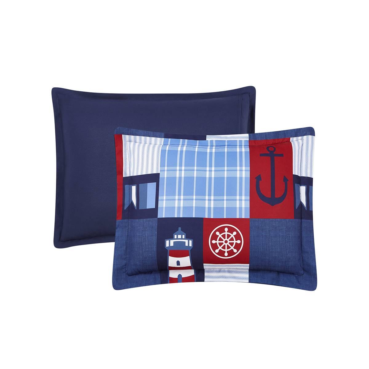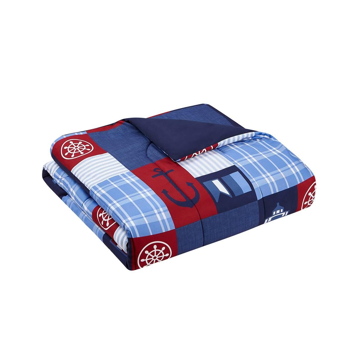 The Home Retreat nautical patch ultra-soft reversible comforter bedding set will create a coastal oasis in any bedroom. The printed patchwork design features classic beachside motifs of a lighthouse, anchor, flags, and ship´s wheel with plaids and stripes in bold red, white and blue color scheme. It reverses to a perfect blue solid to match.