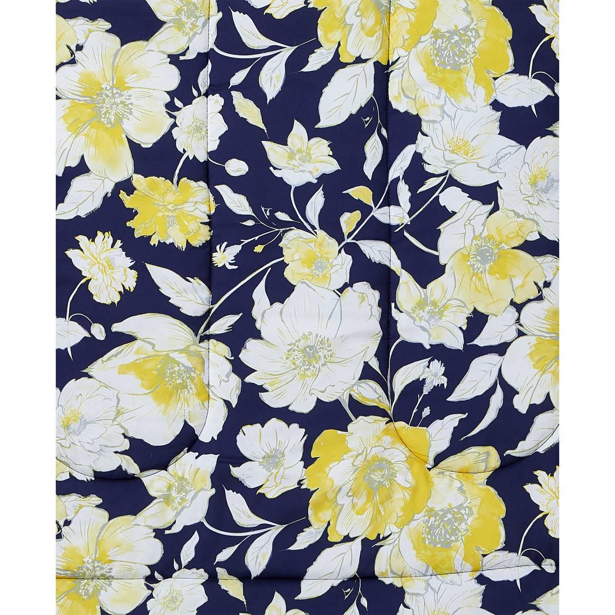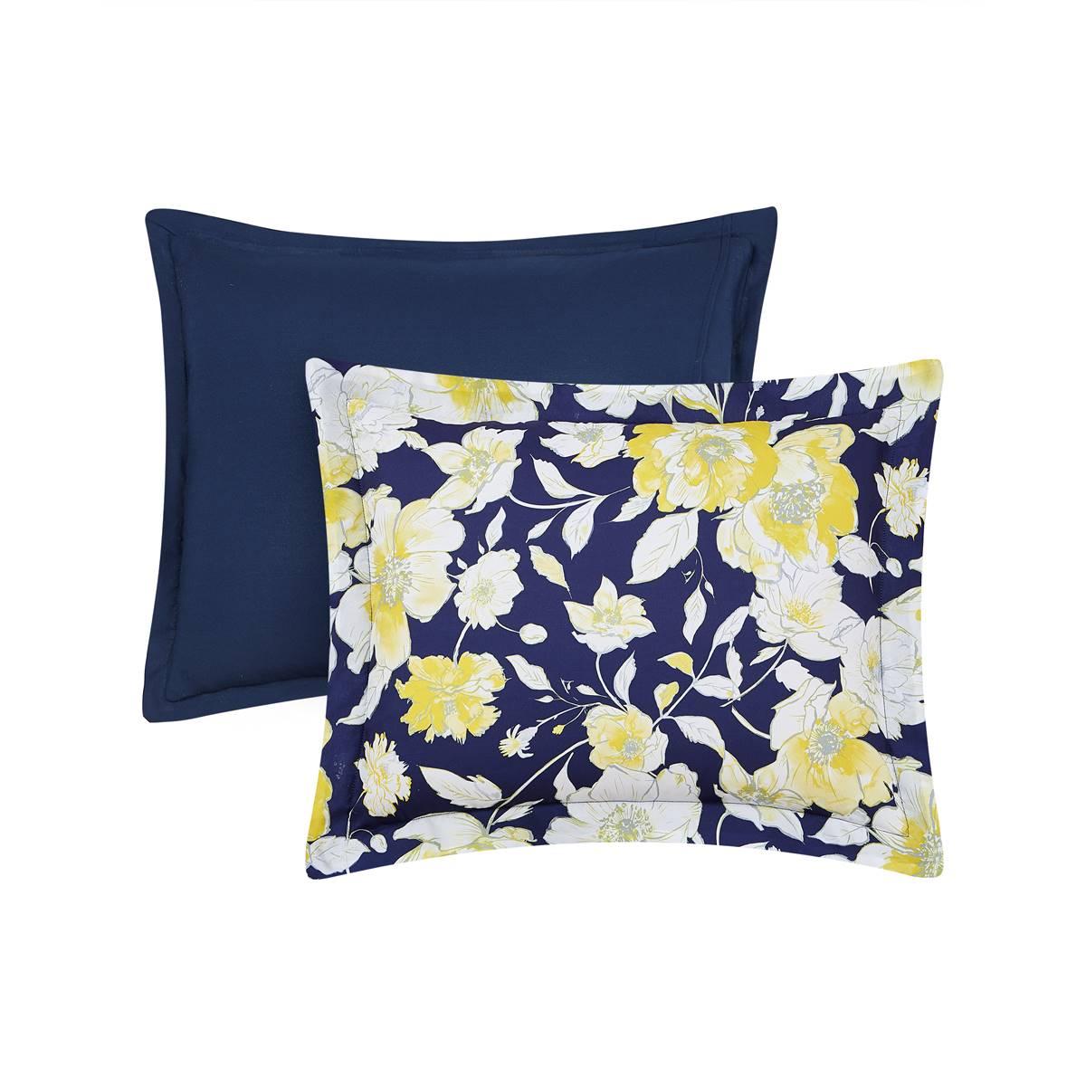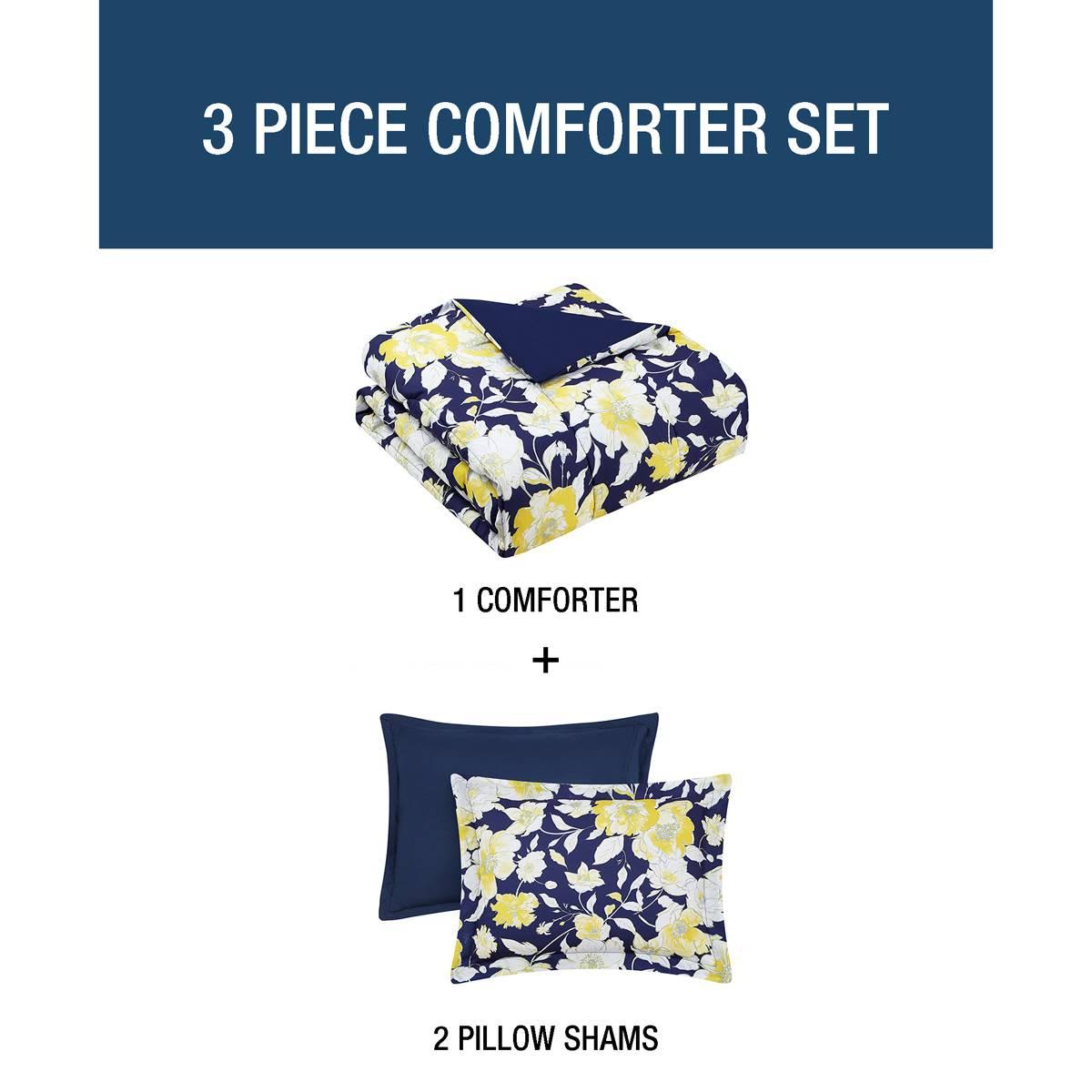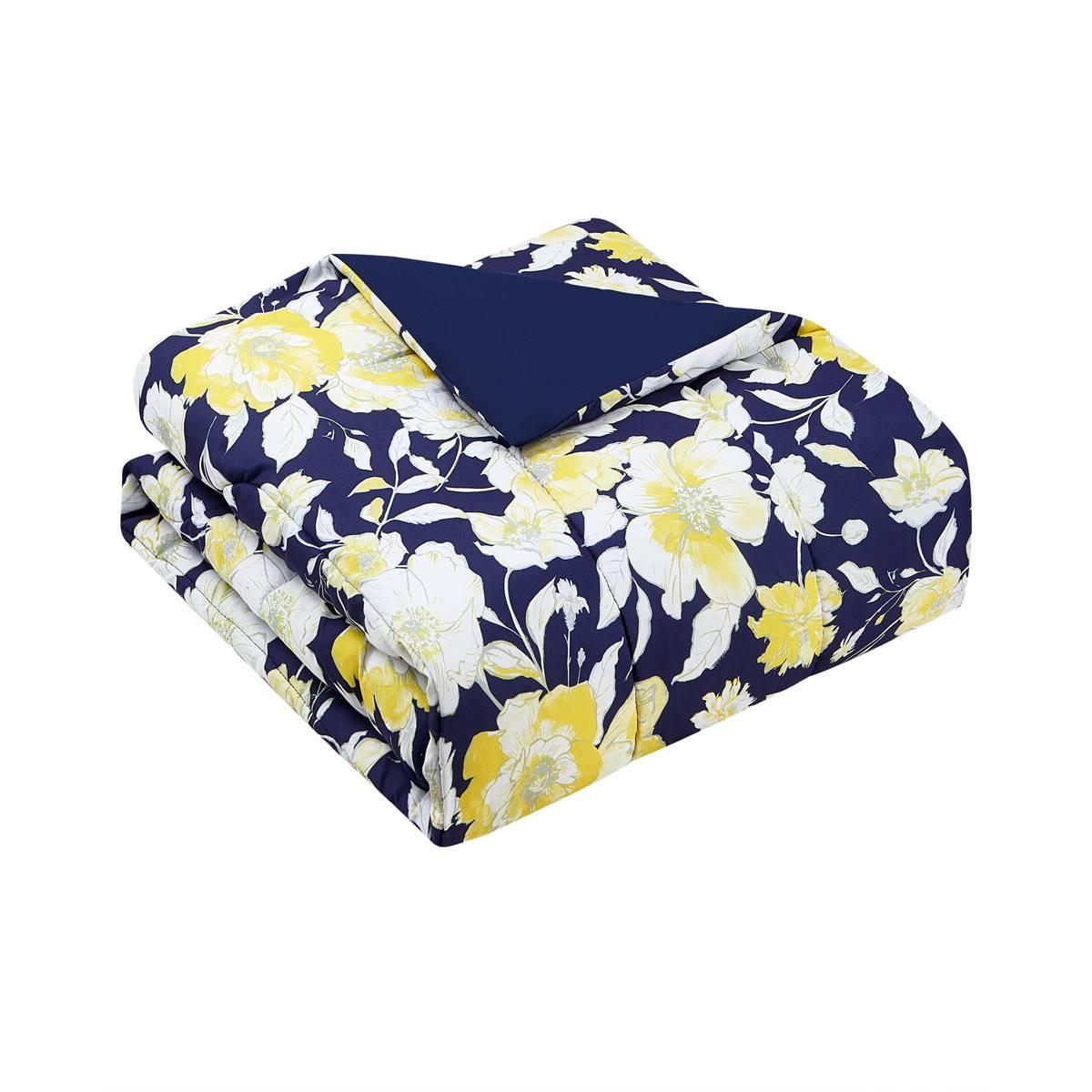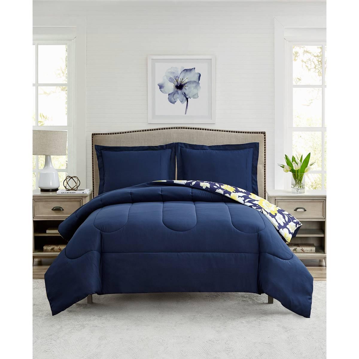 Create an elegant bedroom oasis with this Cedar Court Aster floral ultra-soft comforter reversible bedding set. Yellow, white, and grey flowers and leaves pop off against the dramatic deep navy background. The comforter and shams reverse to a navy solid.