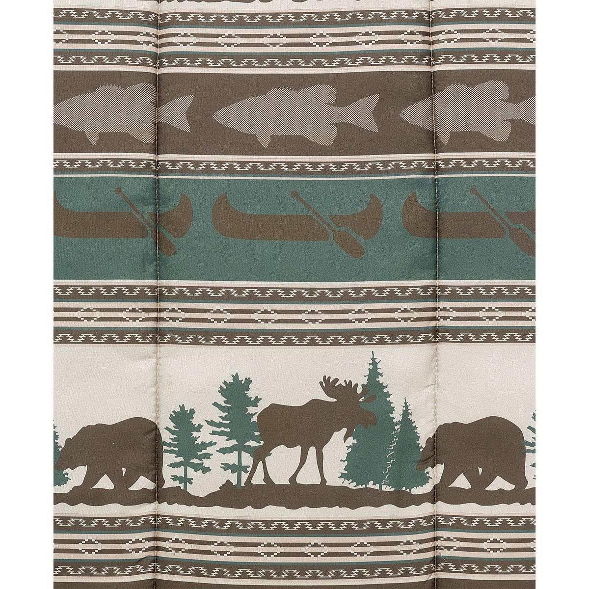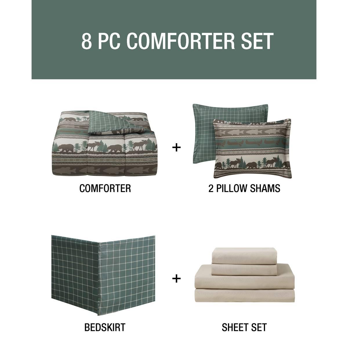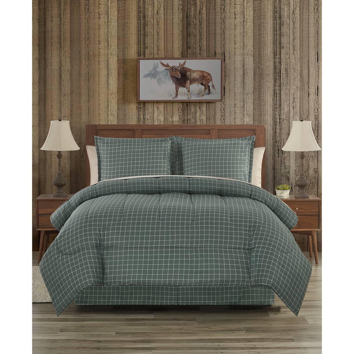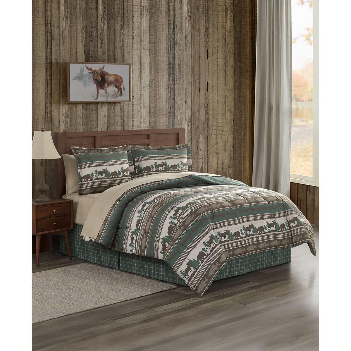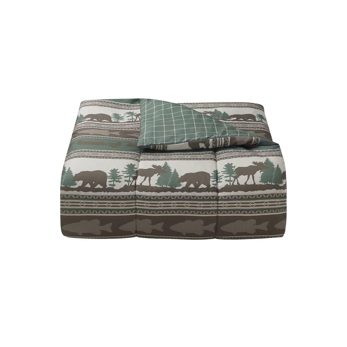 Complete your rustic retreat with this Cedar Court mountainside reversible comforter bedding set. Decorated with classic outdoor elements of moose, bears, canoes, fish, and evergreens, it is fully reversible to a green and tan windowpane plaid design.