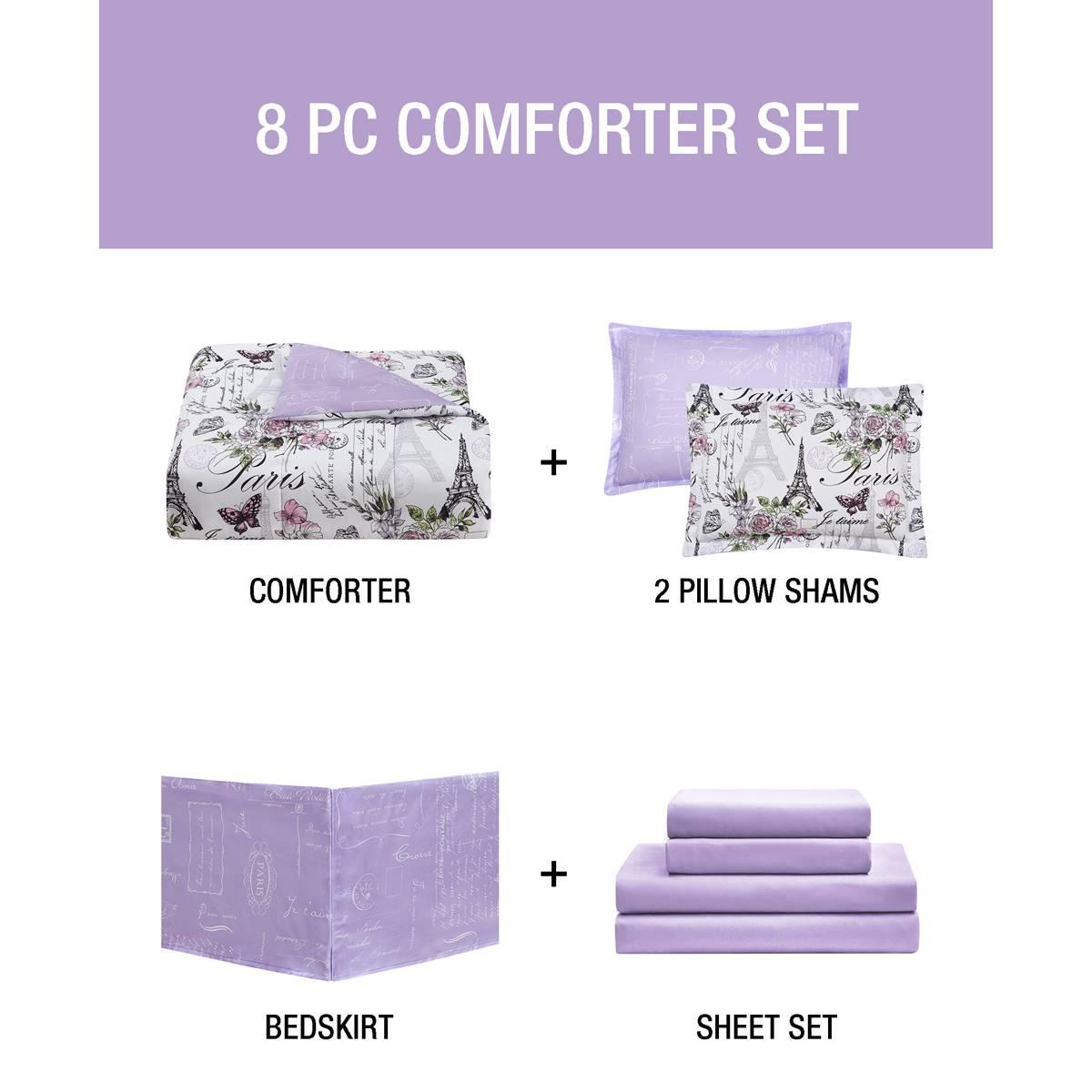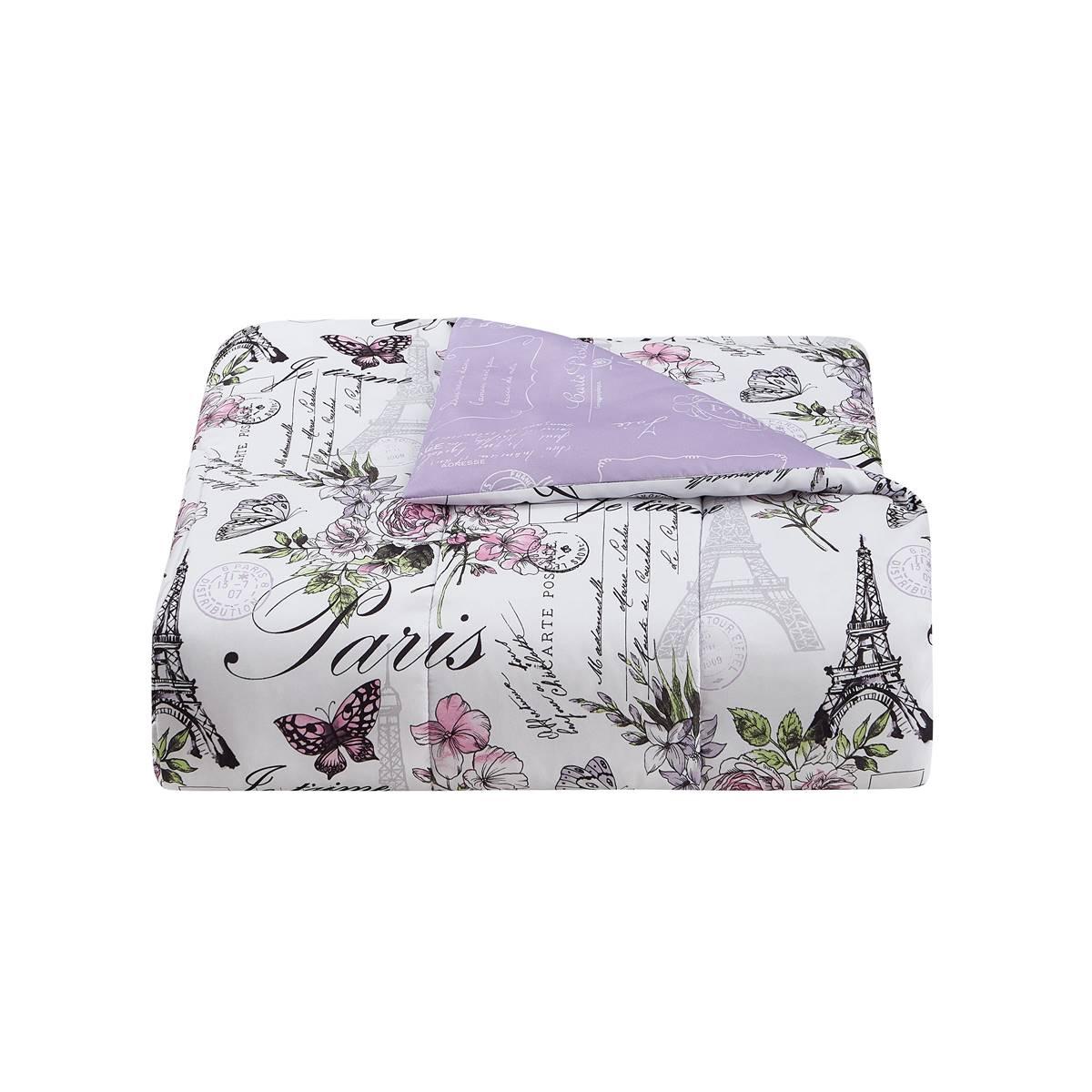 Travel to the city of lights with this Cedar Court Paris floral reversible comforter dedding set. Eiffel towers, roses, botanical leaves, postcards, and script French sayings decorate this set. The white background has pinks, lilac, green, grey, and soft black colors. It reverses to a soft lilac script typography print that decorates the bed skirt.