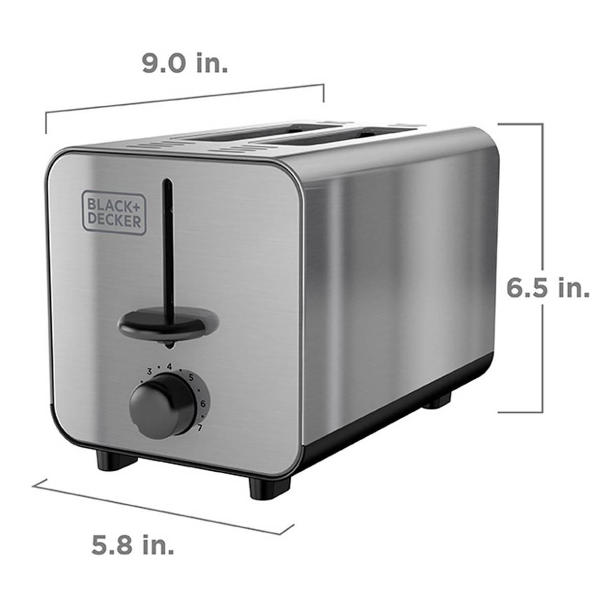 Description Black & Decker stainless steel 2 slice toaster. With extra-wide self-centering slots for your artisan bread, bagels, and more. This Black & Decker 2-slice toaster is...