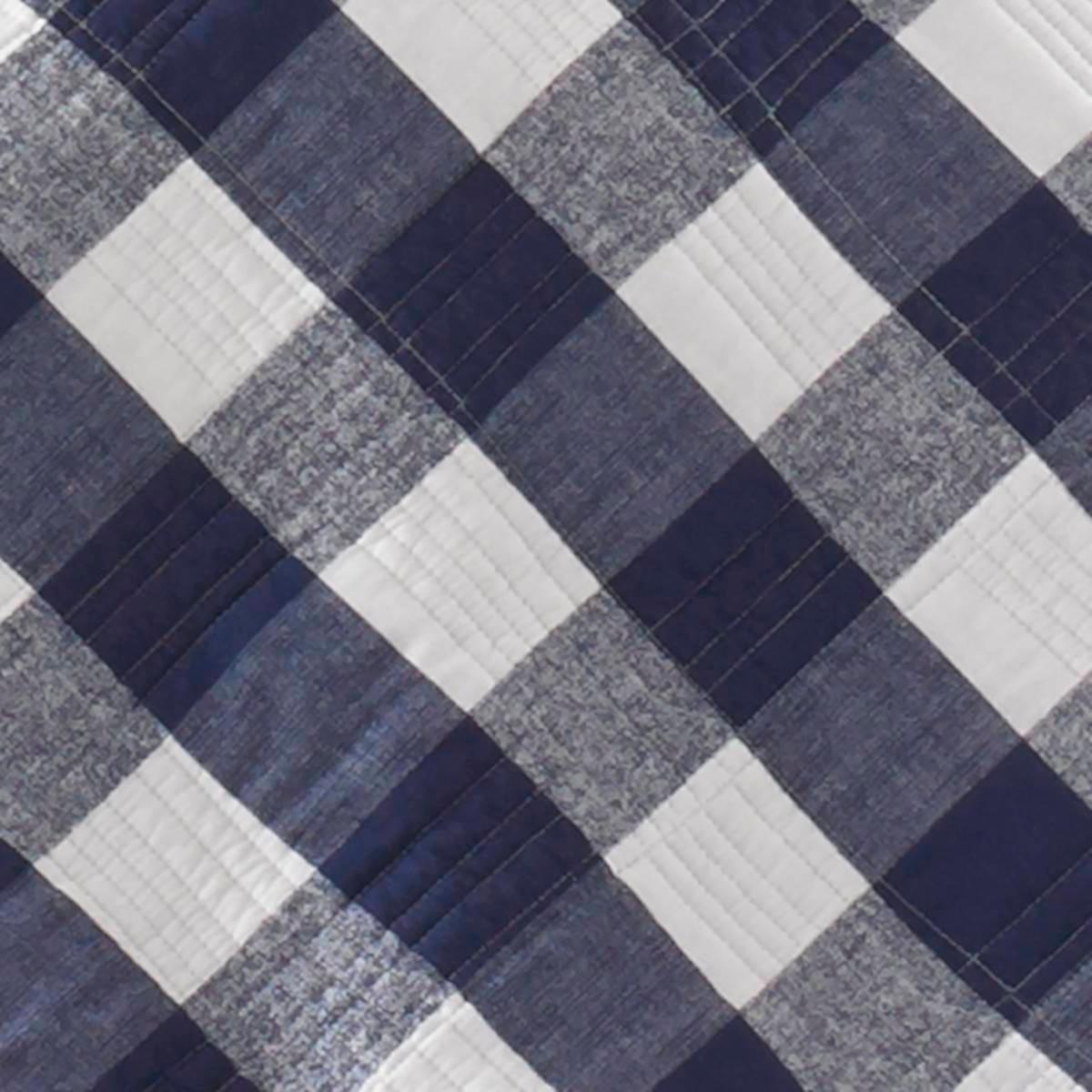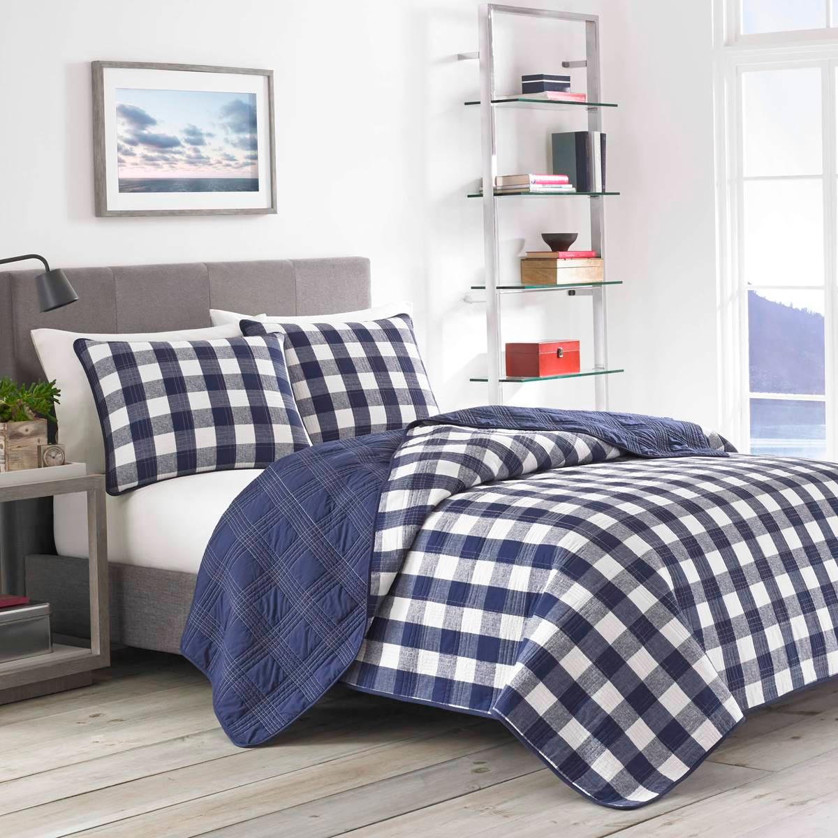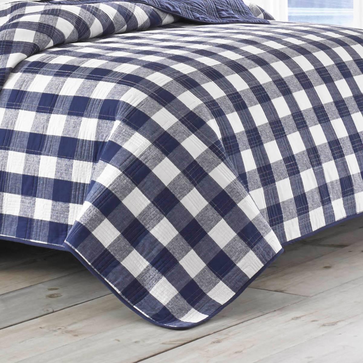Upgrade your bedding with this Eddie Bauer Lakehouse 136 Thread Count Reversible Quilt Set. Features a modern check design that is as timeless as is it handsome, in shades of navy on a white background. Reverses to a solid navy with contrast stitch in white.