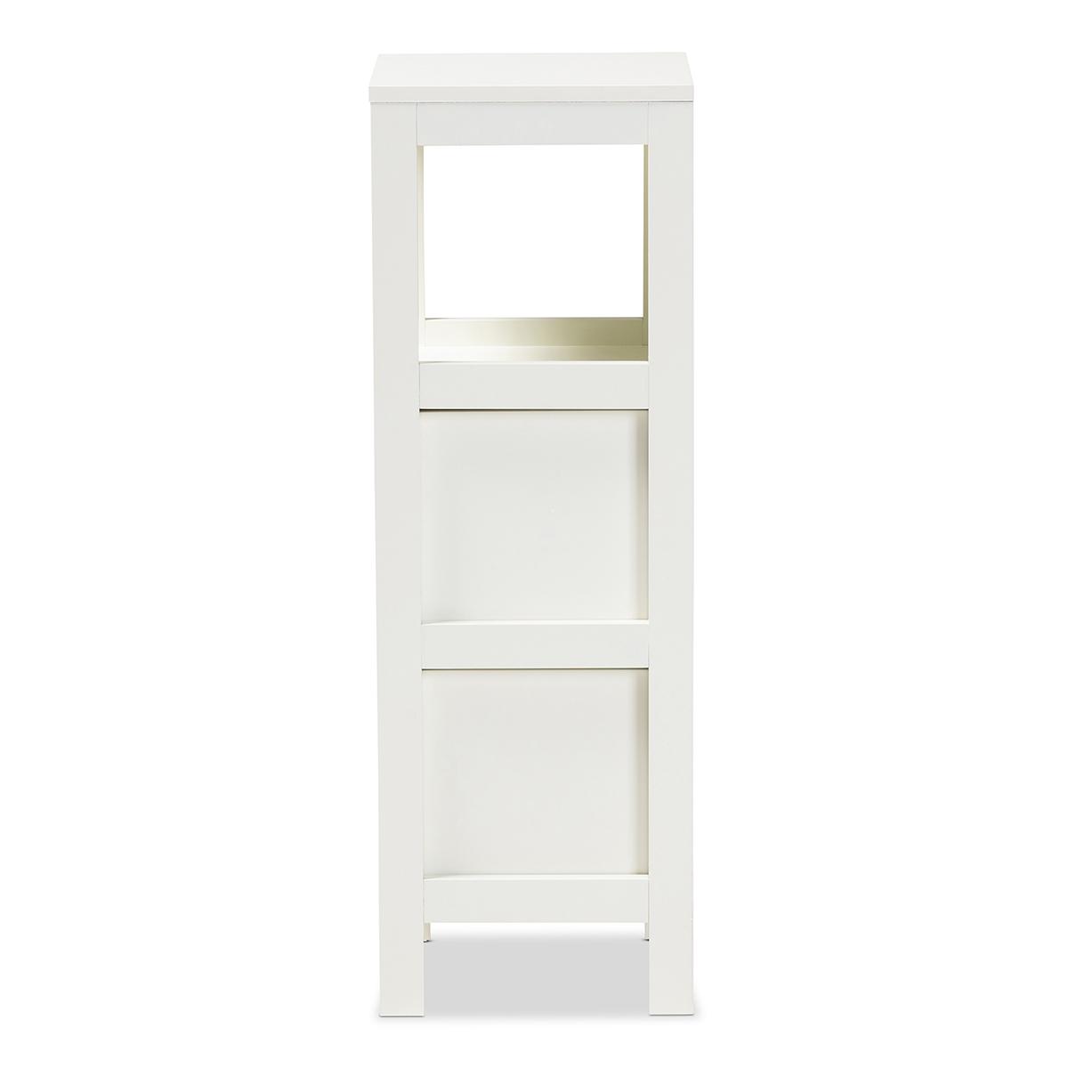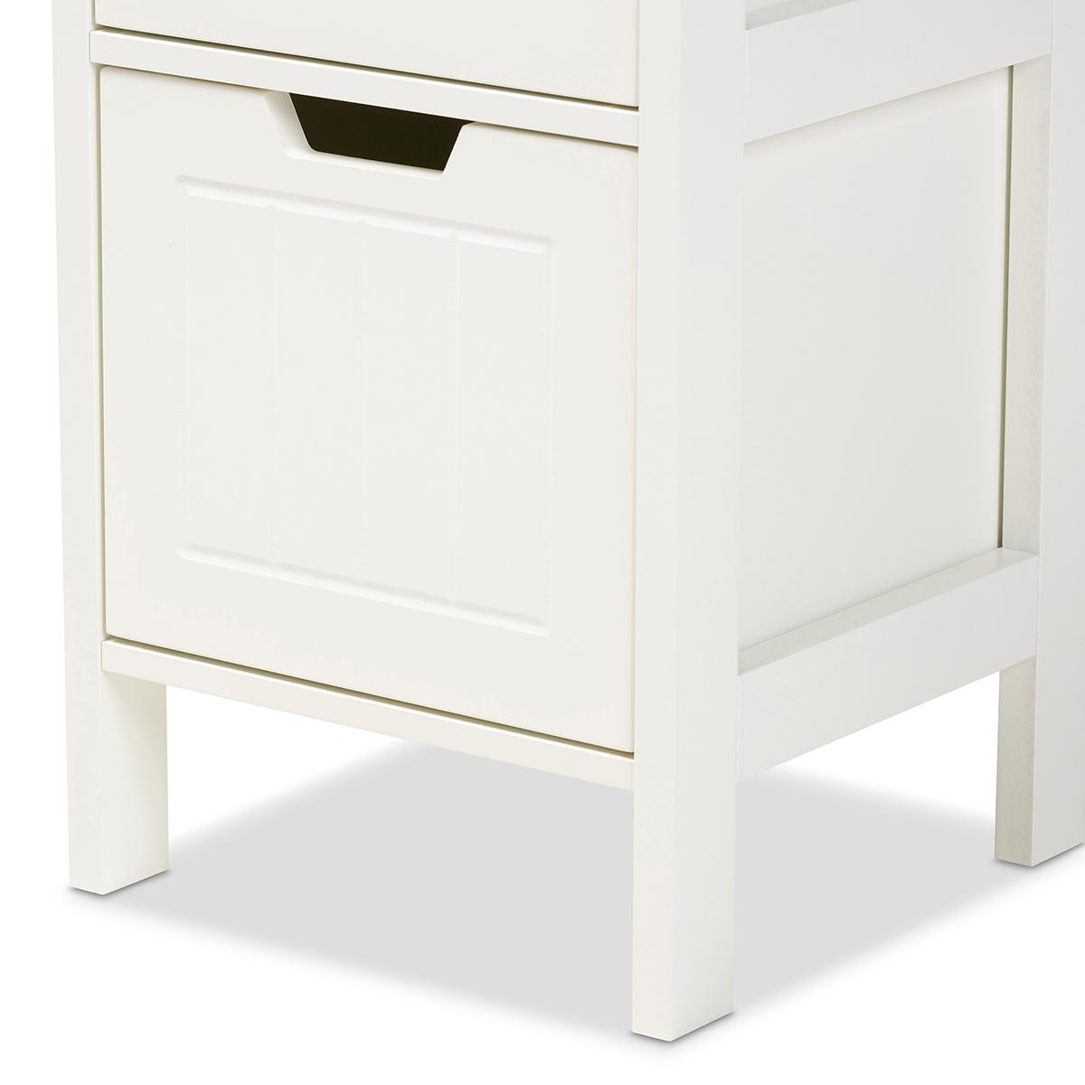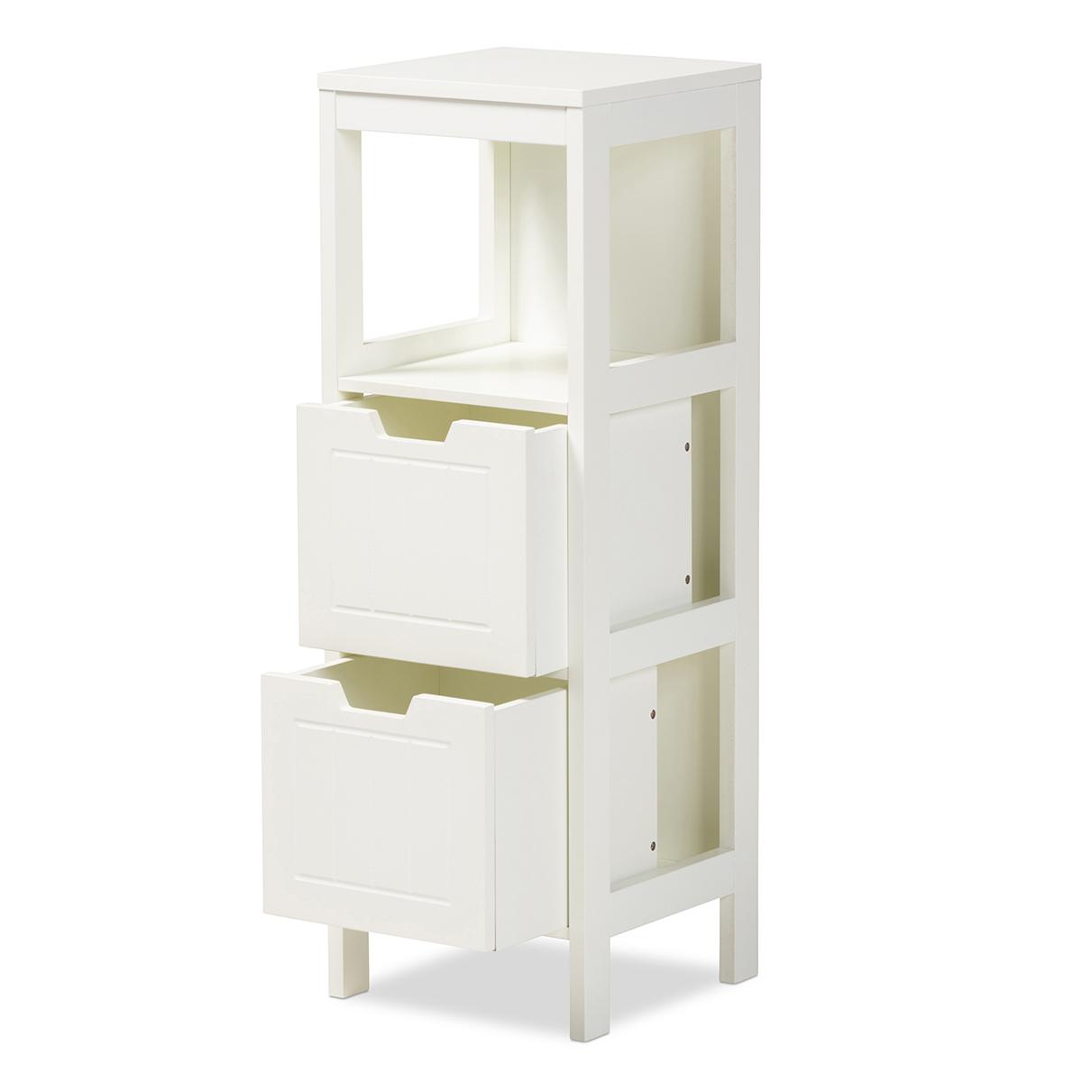 Bring order to busy entryways with the well-designed Baxton Studio Reuben Storage Cabinet. Crafted from wood, the Reuben features a clean white finish. Ample storage space is provided by two drawers and one shelf. Designed for versatility, the drawers can be switched to one of three shelves. The slatted drawer fronts provide a refined look, while cut-out handles lend a modern touch.