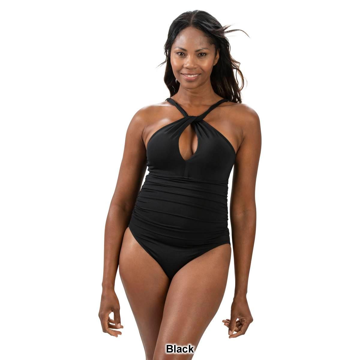 Description WOW! This Womens Dolfin® Aquashape solid contemporary one piece swimsuit is gorgeous and full of life, just like you! With a center front keyhole and halter...