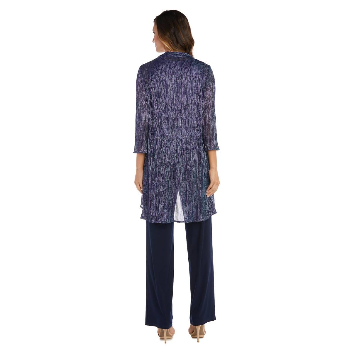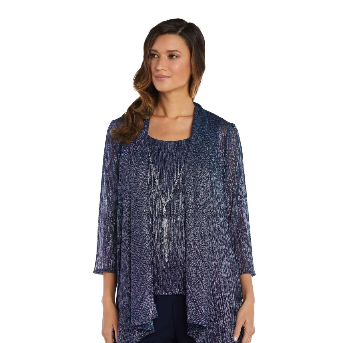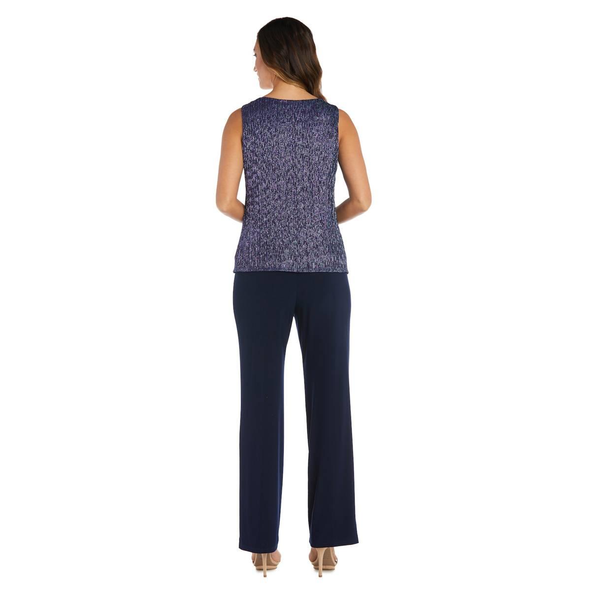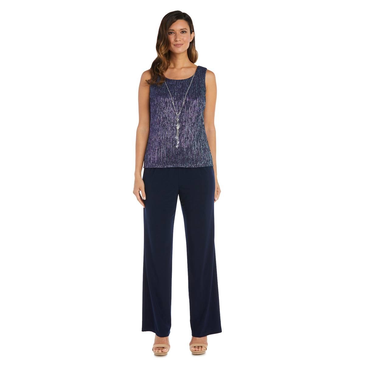 This elegant Petite R&M Richards three-piece set is for evenings out or formal occasions. Straight-leg trousers with a relaxed fit flatter and elongate the legs, making sure you look your best. A sleeveless top with a scoop neckline and relaxed fit shimmers in metallic lace. The additional necklace adds a stunning touch of elegance. Also comes with a matching jacket that has long sleeves. Add this pants set to your closet today.Tank Top: