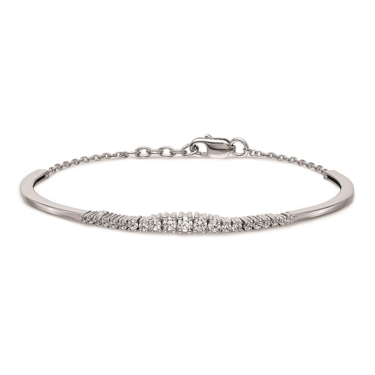 Complete your everyday look with this striking 14kt. white gold lab-grown diamond bangle bracelet. With a luxurious polished finish, this bracelet is enhanced with an array of shimmering 0.74ctw. prong set round lab-grown diamonds for a stunning appeal. This enchanting bracelet secures with a lobster clasp.