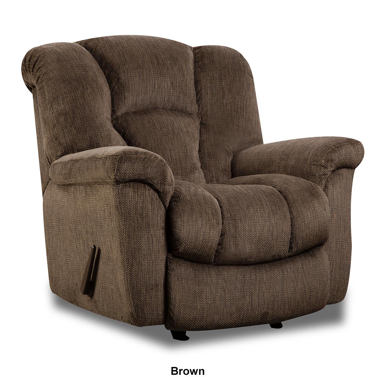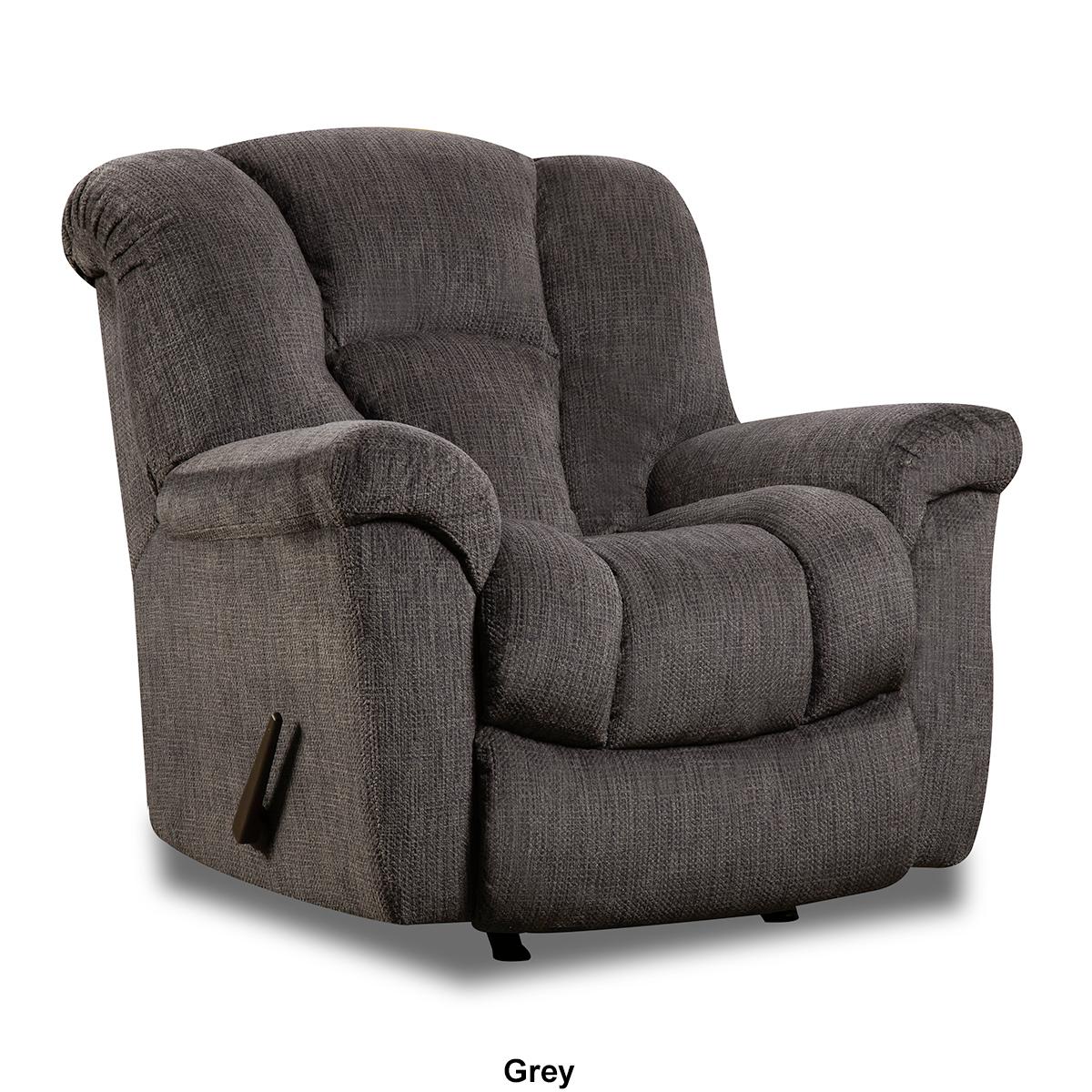 Description Homestretch Carter rocker recliner with plush pad-over-chaise seating. Large scale with 44-inch back, overstuffed arms, and 100% polyester. This item is deliverable...
