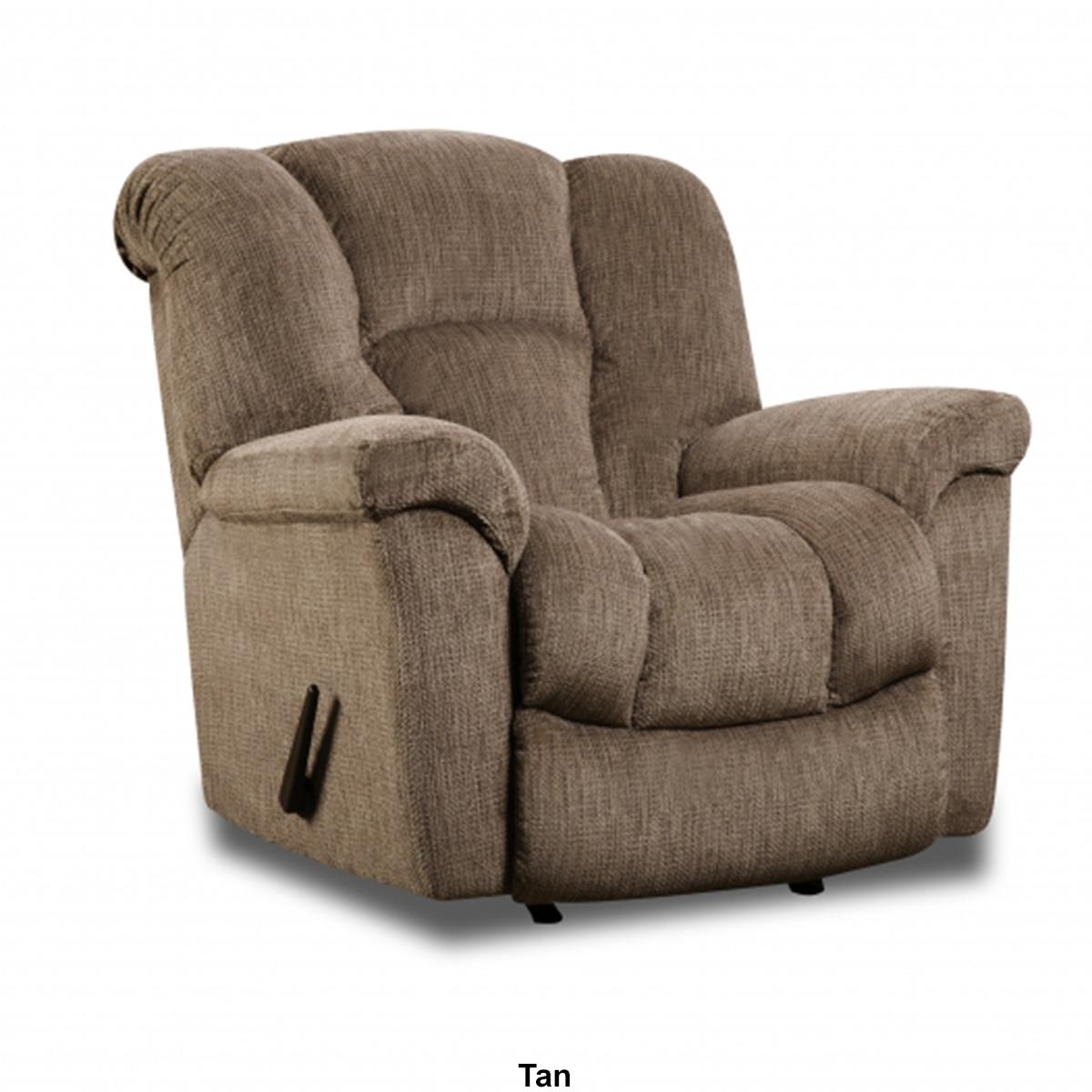 Homestretch Carter rocker recliner with plush pad-over-chaise seating. Large scale with 44-inch back, overstuffed arms, and 100% polyester.