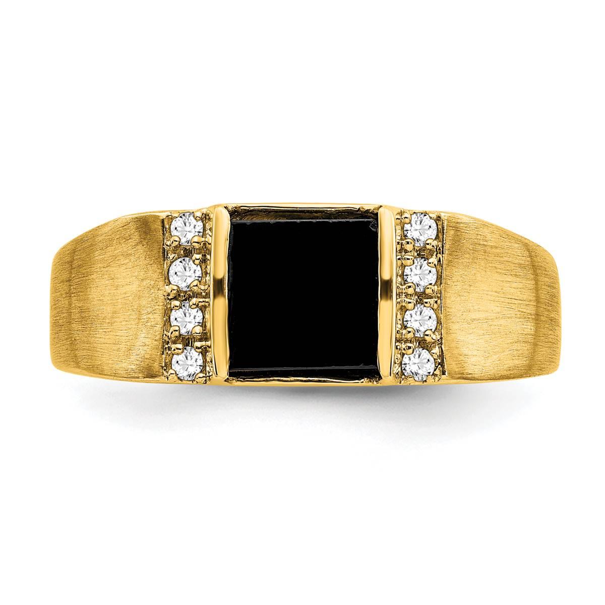 This mens Pure Fire 14kt. yellow gold square onyx ring is the perfect gift for your loved one. Flaunts a single square onyx gemstone in the center flanked by sparkling lab-grown diamonds weighing 0.12ctw.