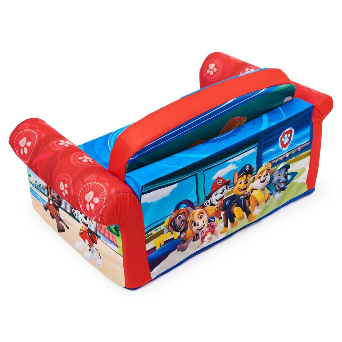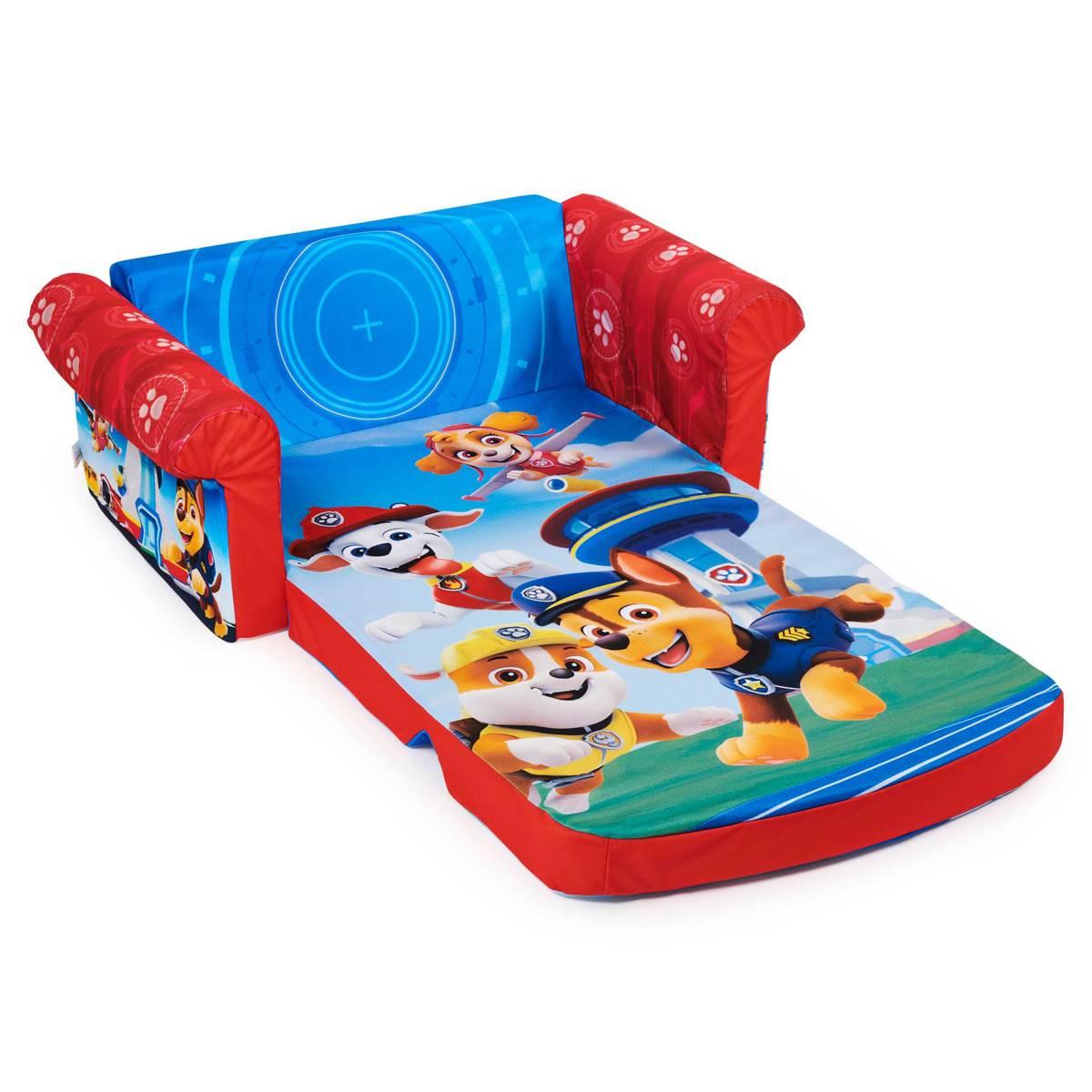 Spin Master Paw Patrol marshmallow furniture children´s 2-in-1 flip-open foam sofa. Preschoolers can sit lounge and relax on their very own sofa along with characters from PAW Patrol and the Marshmallow Flip-Open Sofa. Just the right size for toddlers the lightweight polyurethane foam sofa with removable polyester fabric slip-cover stands about 10 inches tall 28.5 inches wide and 16 inches deep.