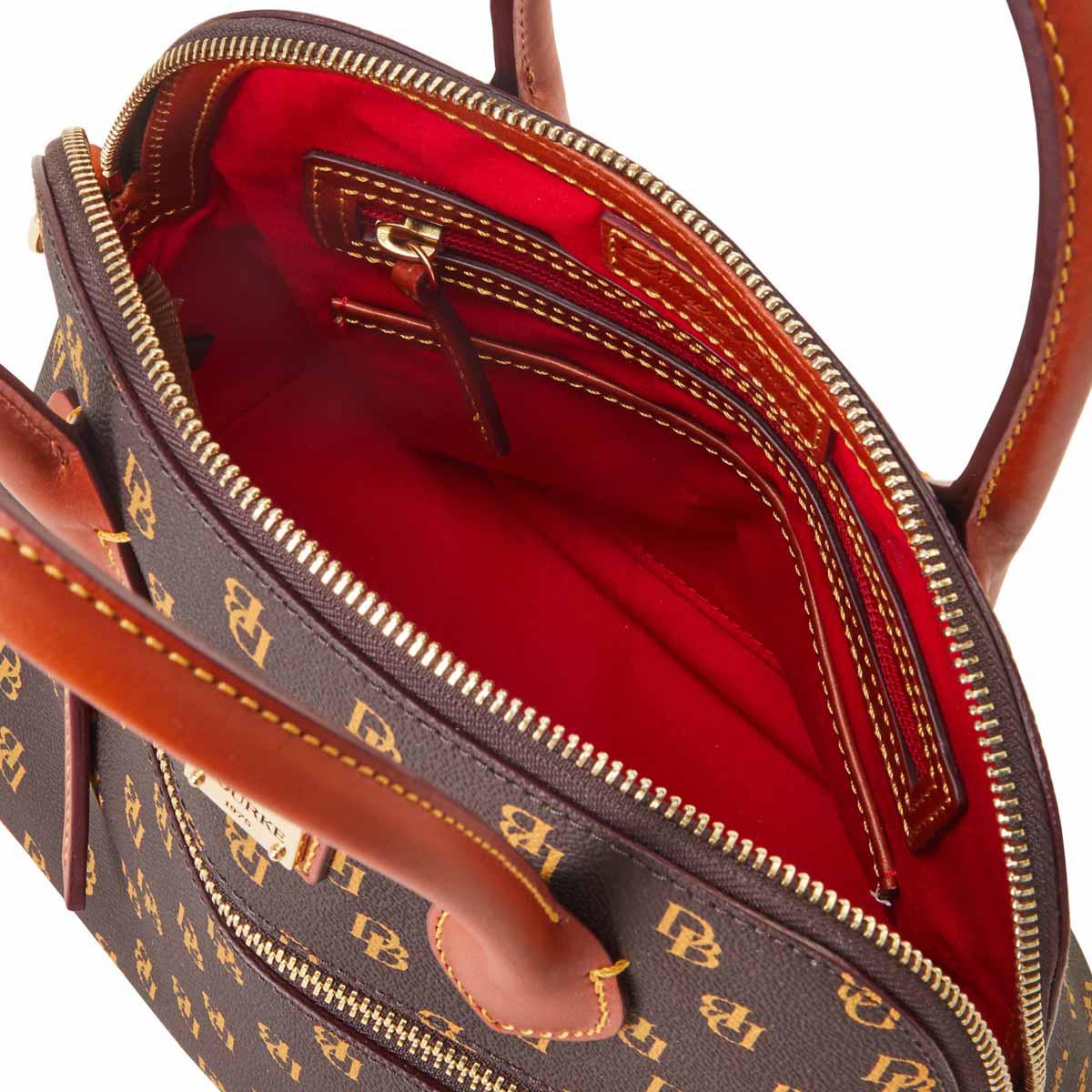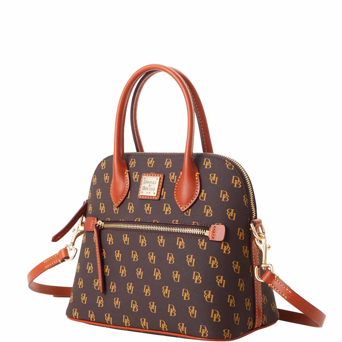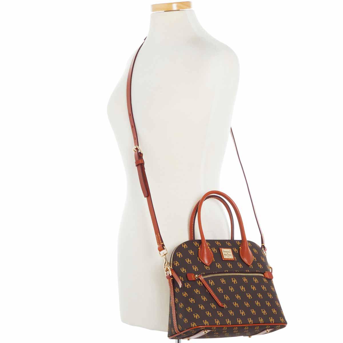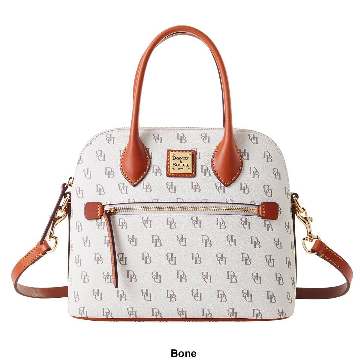 Description This Dooney & Bourke monogrammed domed satchel, made using coated cotton with a silky finish, adds fun flair to any look. This chic bag includes dual handles, a...