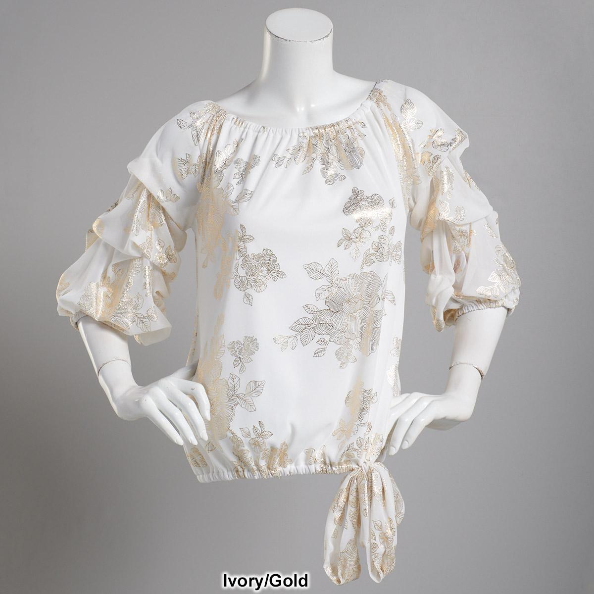 Add A sophisticated style to your wardrobe with this Plus Size MSK blouse features a foil design, a square neckline, and elbow lantern sleeves with a tie front.