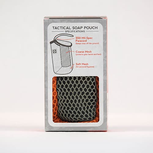 This U.S. military-grade tactical soap pouch should be standard-issue for every shower. To maximize hygiene in tactical situations, this equipment is engineered with a coarse mesh to scrub your hands and feet, and a softer mesh for less rough areas. The 550-mil-spec paracord keeps your large soap off the ground. Perfect for home, outdoor, or just about anywhere. Soap not included.