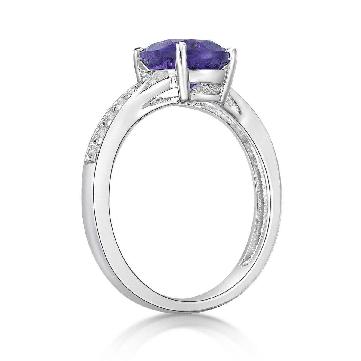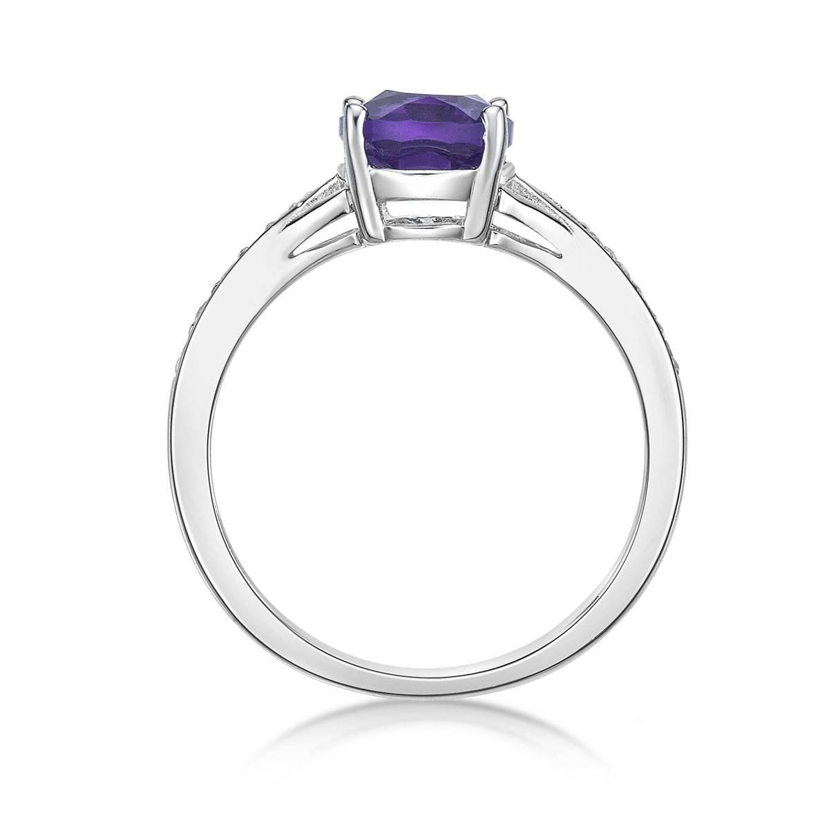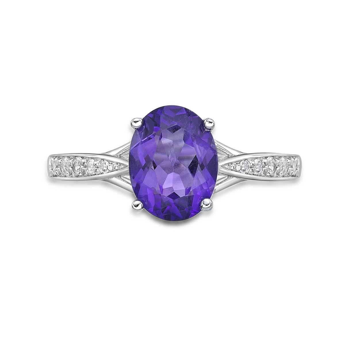 Crafted in sterling silver, this eye-catching ring features a dazzling 9x7mm oval-shaped genuine purple amethyst center stone. Glimmering white topaz accents decorate the ring´s exquisite shank. A splendor to behold, this gorgeous design is the perfect choice for any special occasion.