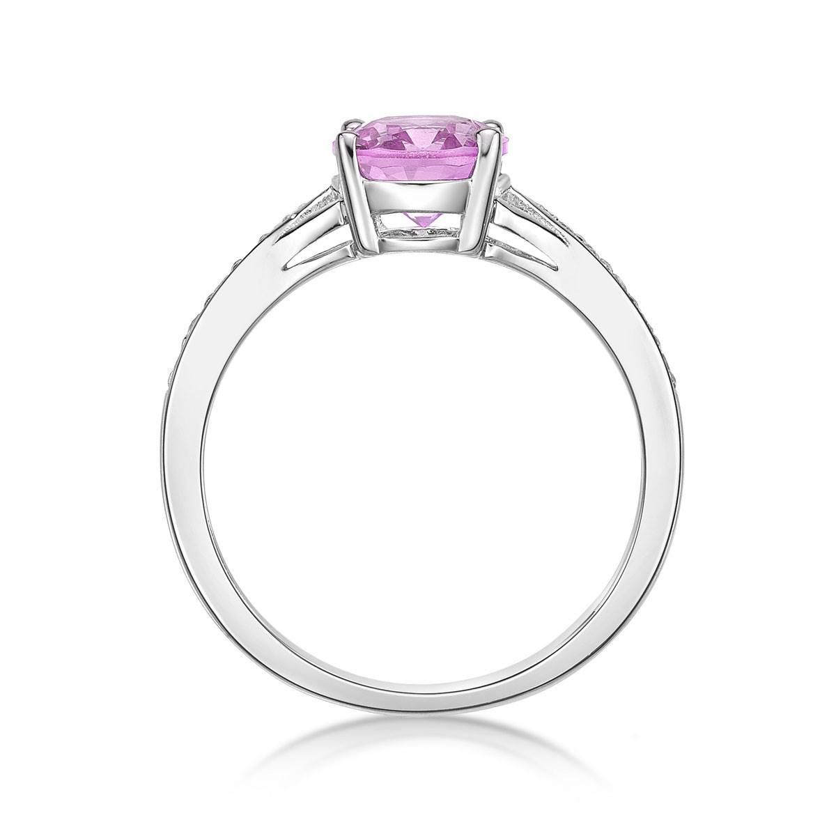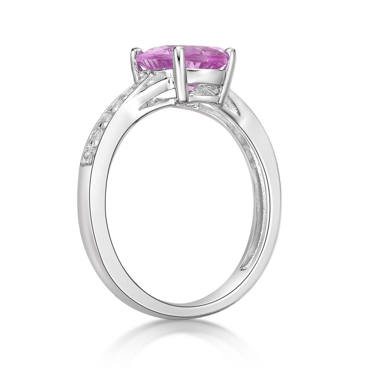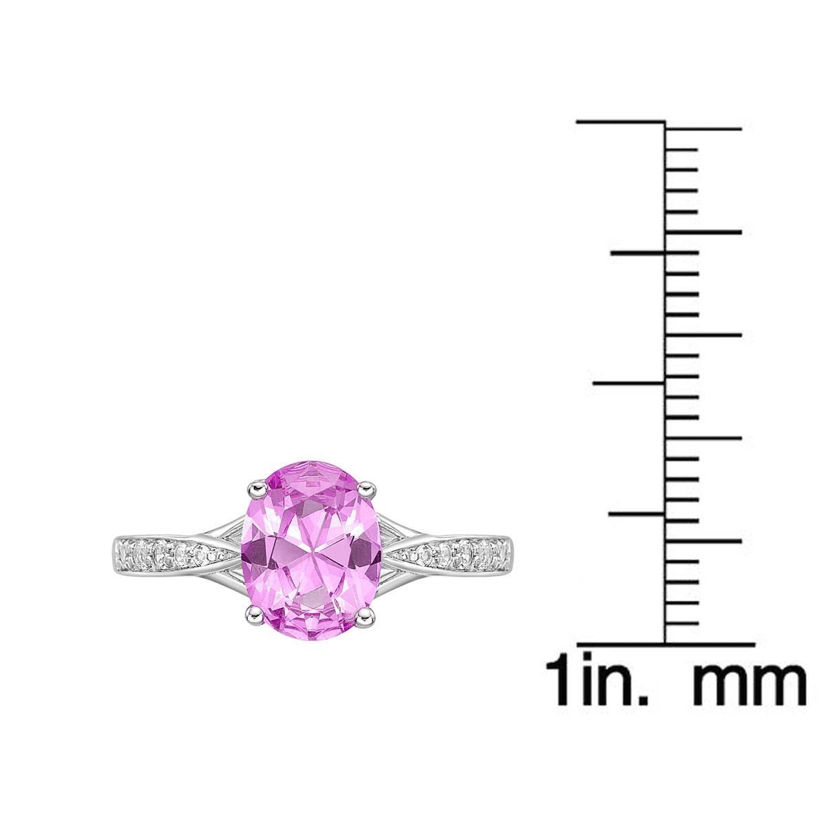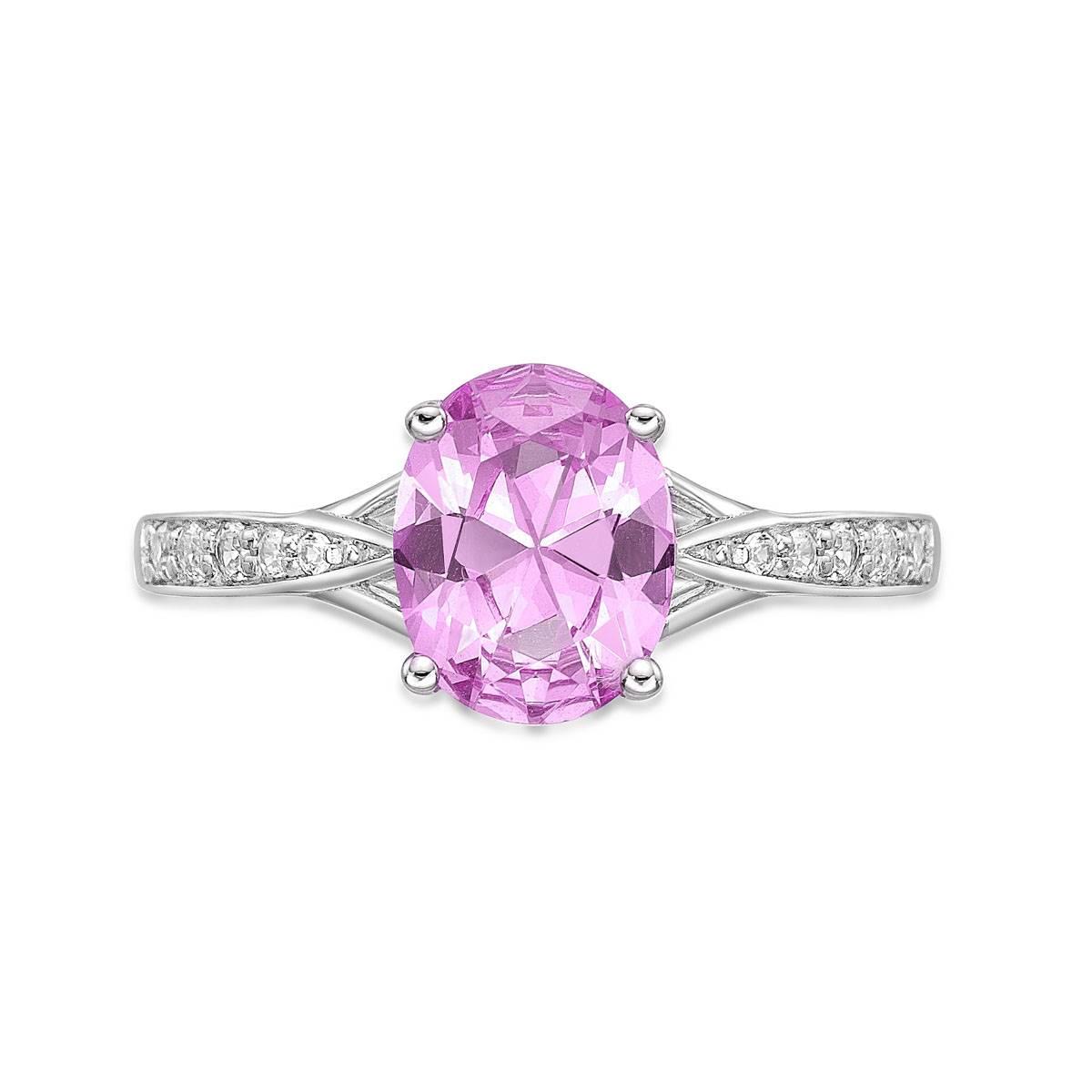 Description Crafted in sterling silver, this eye-catching ring features a dazzling 9x7mm oval-shaped lab-created pink sapphire center stone. Glimmering white topaz accents...