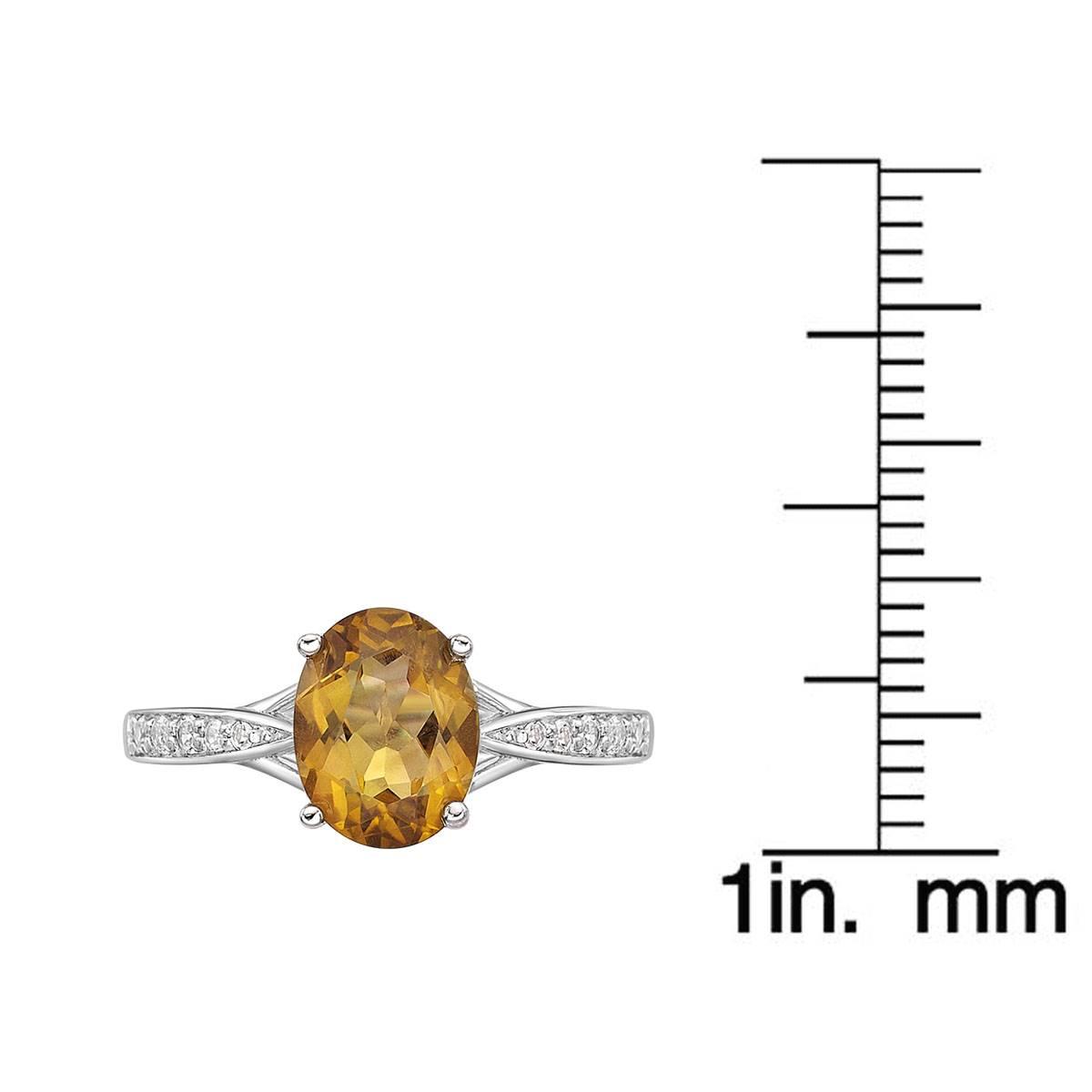 Description Crafted in sterling silver, this eye-catching ring features a dazzling 9x7mm oval-shaped genuine yellow citrine center stone. Glimmering white topaz accents decorate...