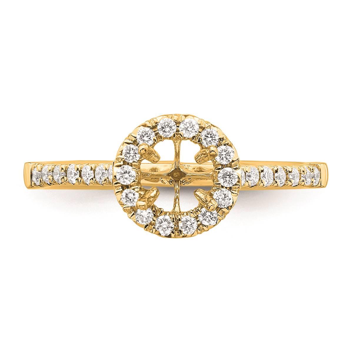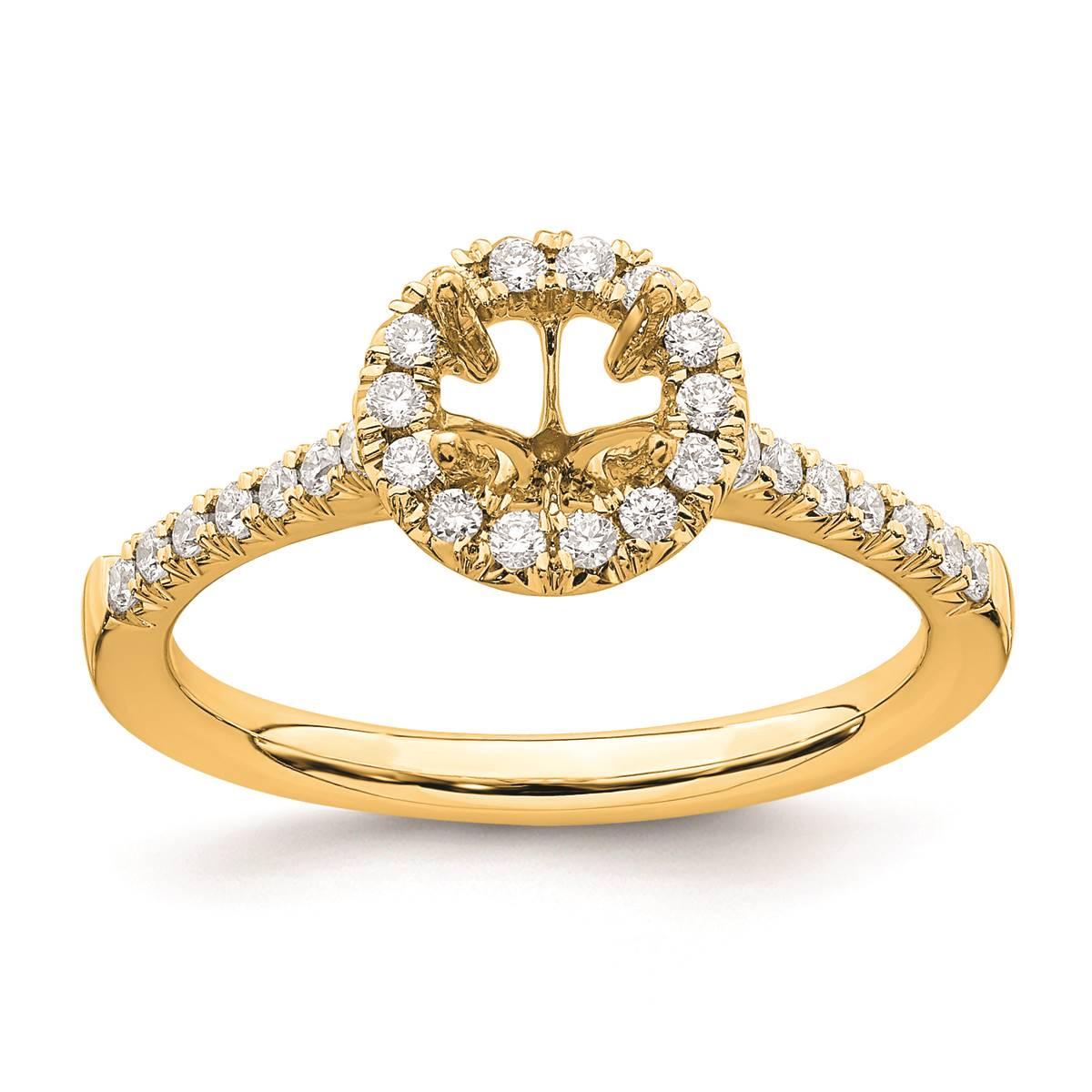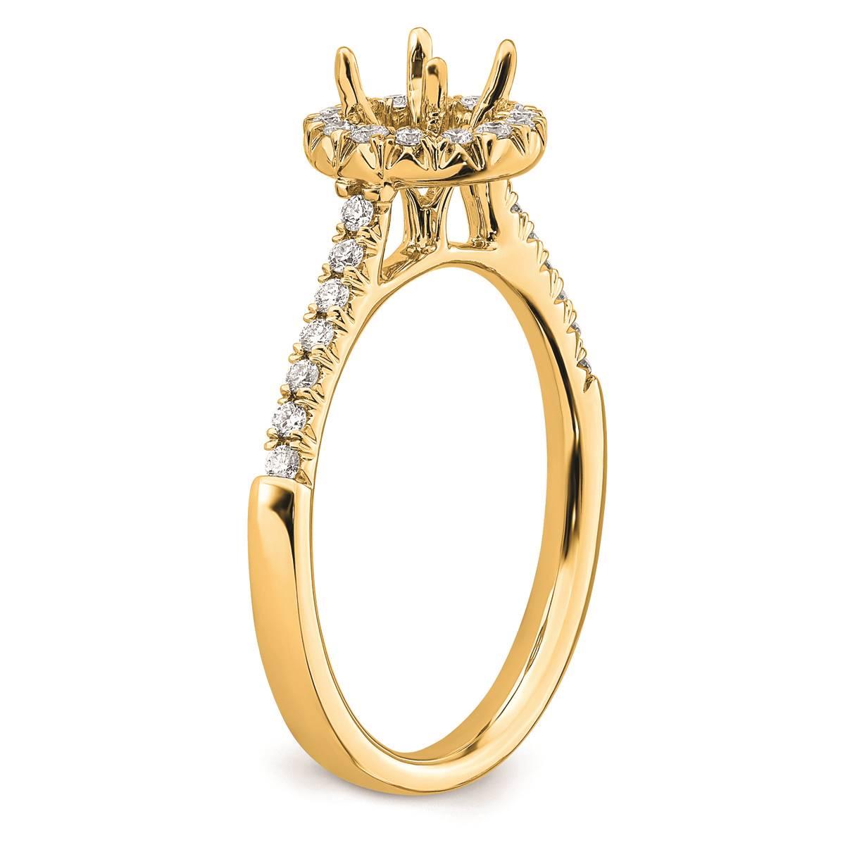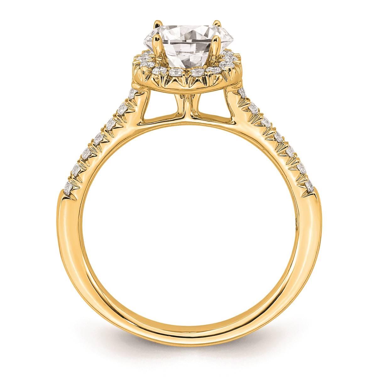 Description This classic halo-style engagement ring is fashioned from 14kt. yellow gold. This polished finish sparkling lab-grown diamond-studded ring showcases a 5.2mm round...
