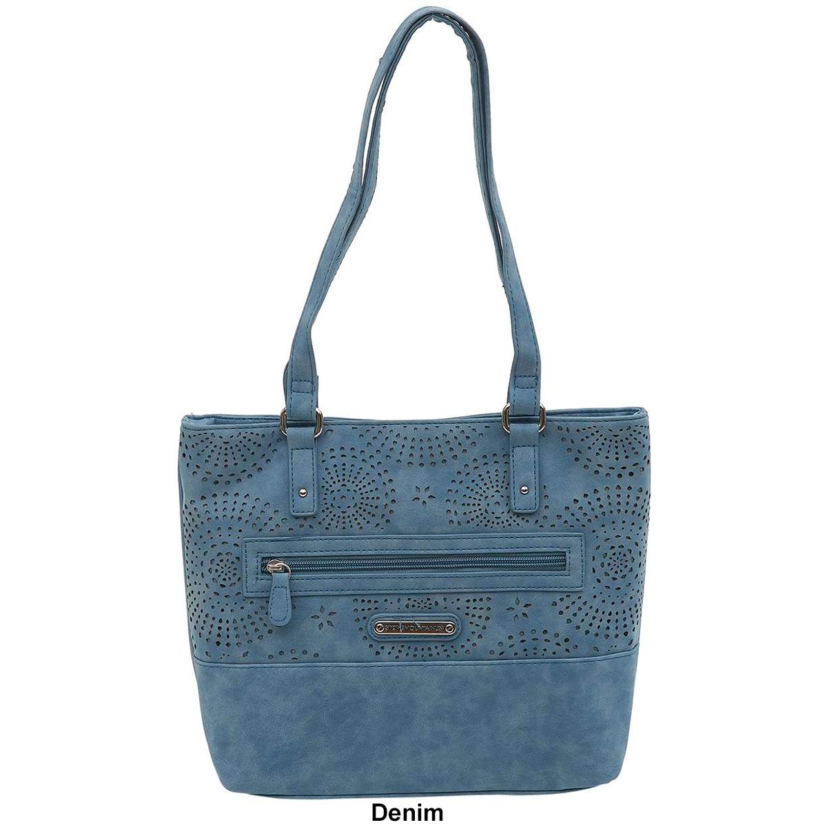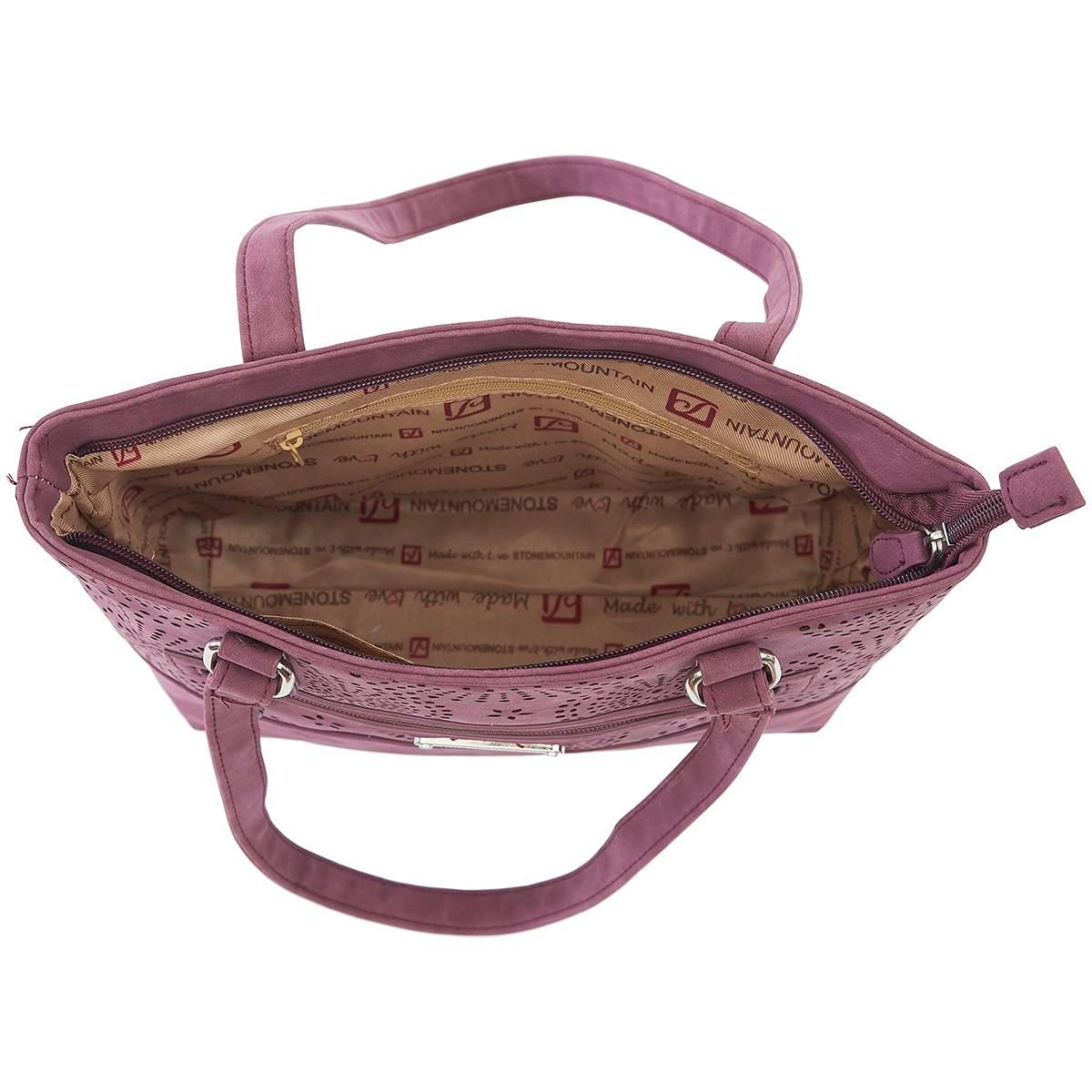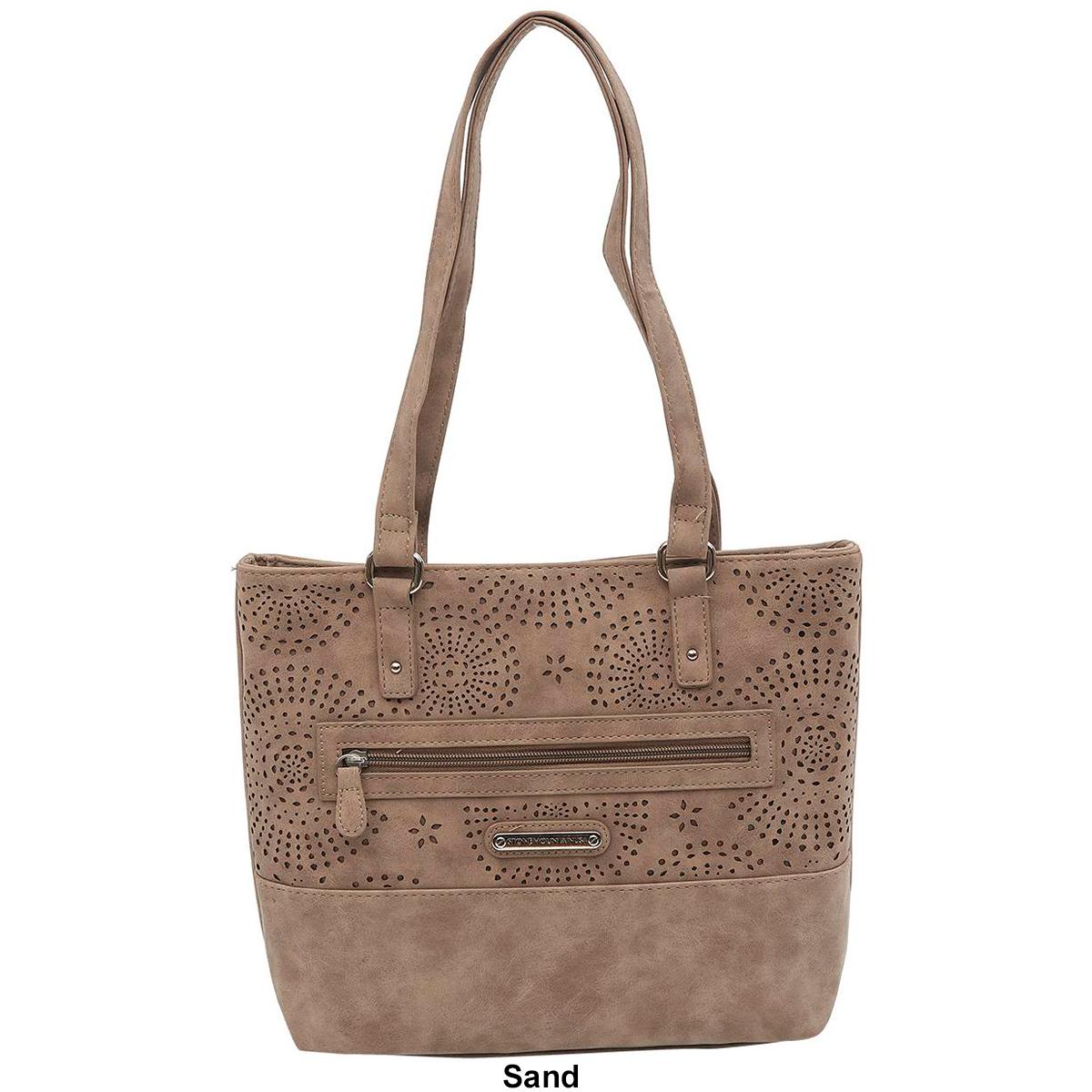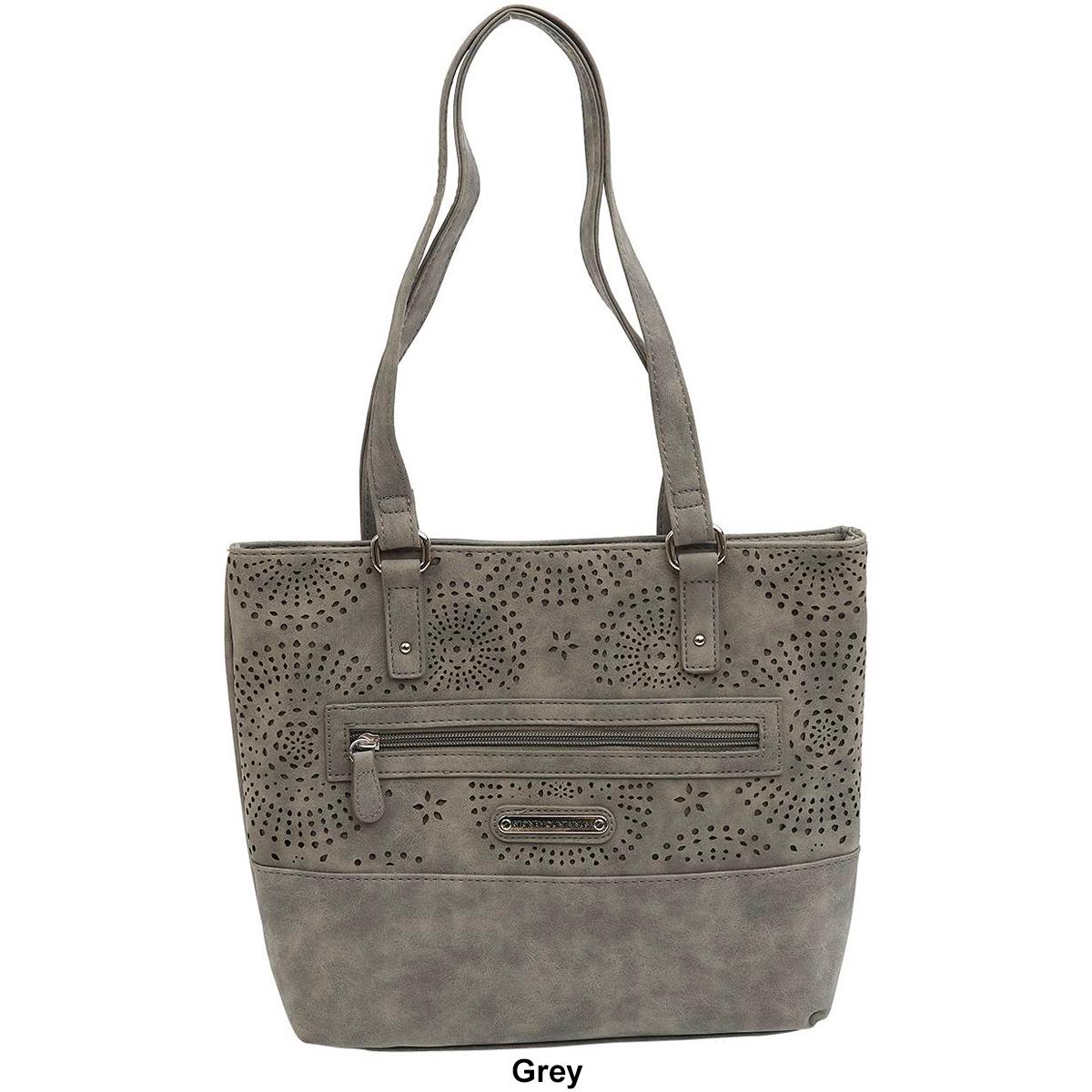 Description This Stone Mountain Nubuck perforated vinyl Donna tote is a wonderful option for every day. Featuring two shoulder straps, top zip closure, zip pockets, and enough...