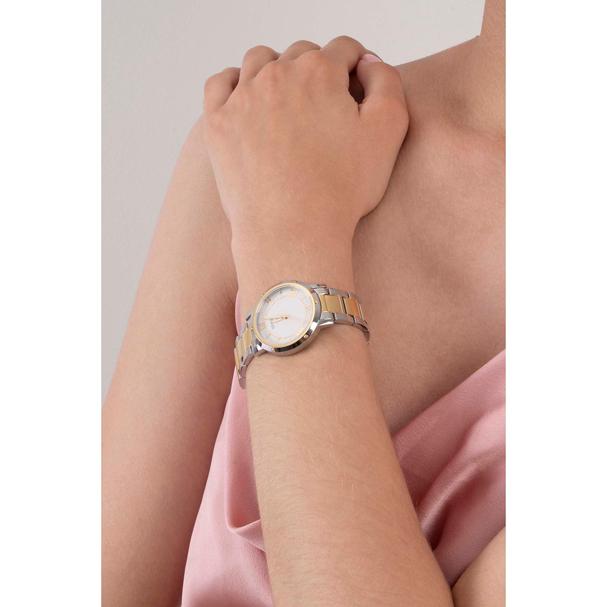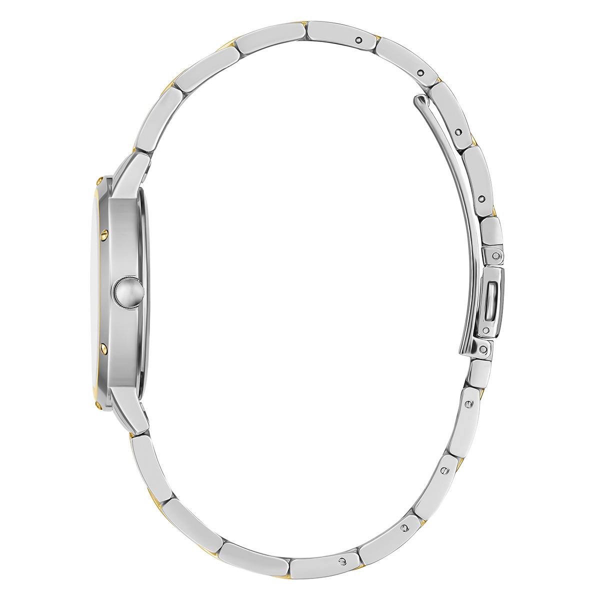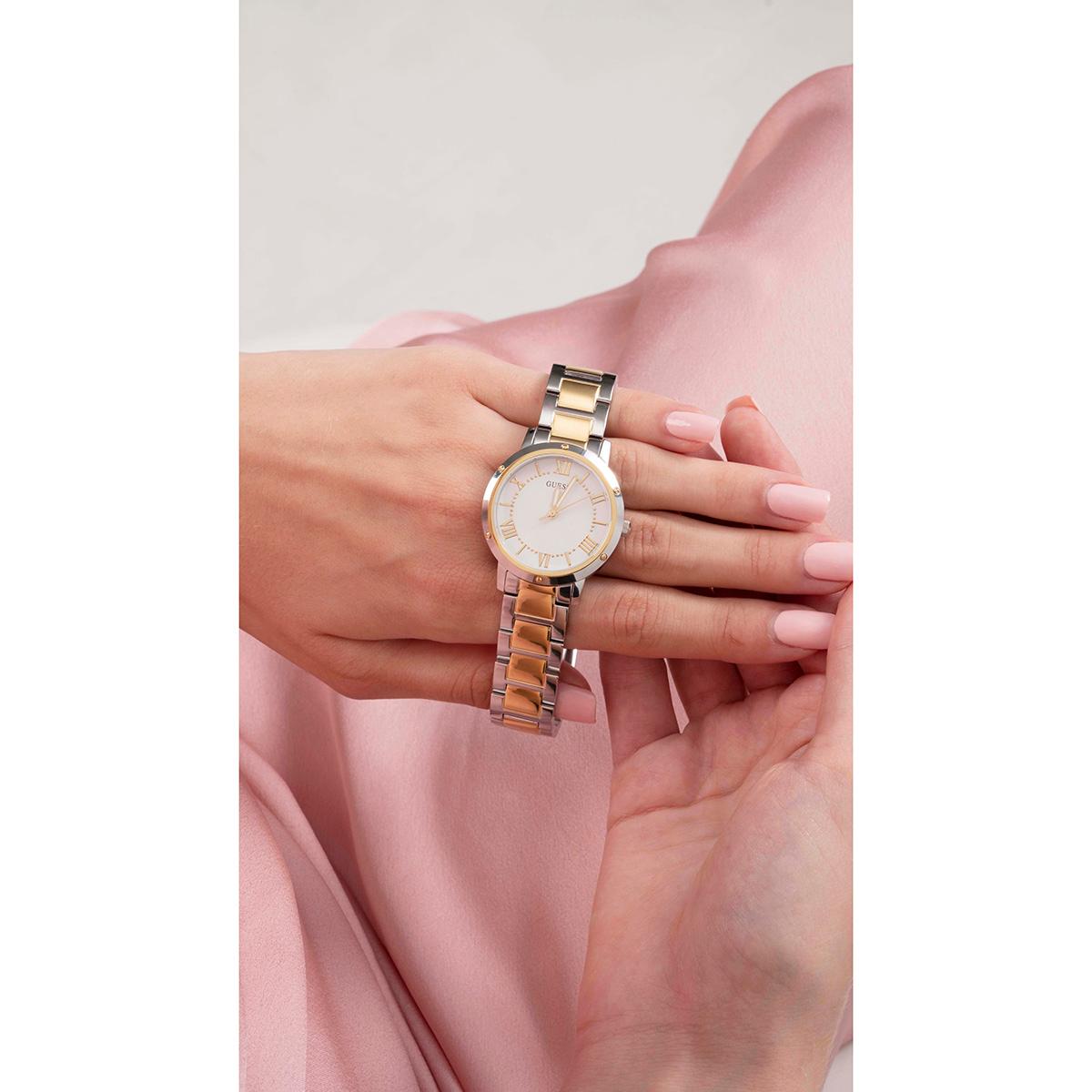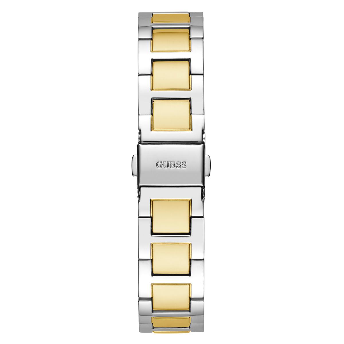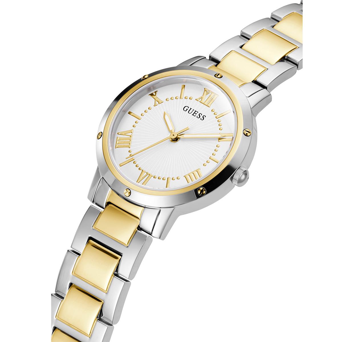 Description Dress up your day in this Womens Guess refined timepiece complete with screw details on the bezel and a textured roman dial. 2-tone Case2-tone Stainless Steel Band...