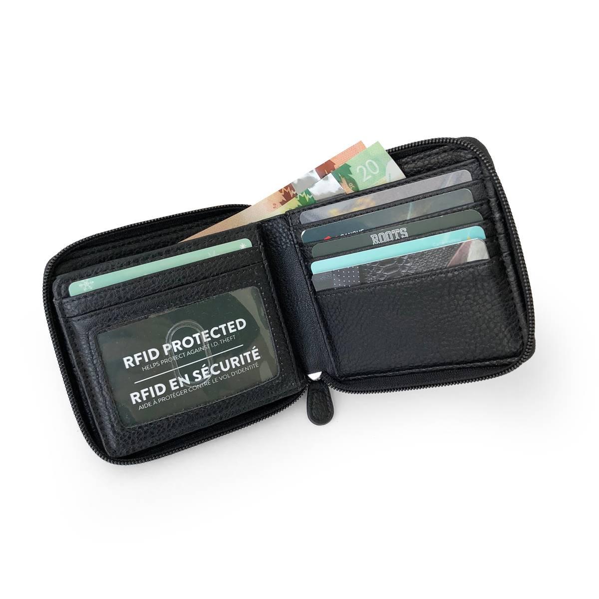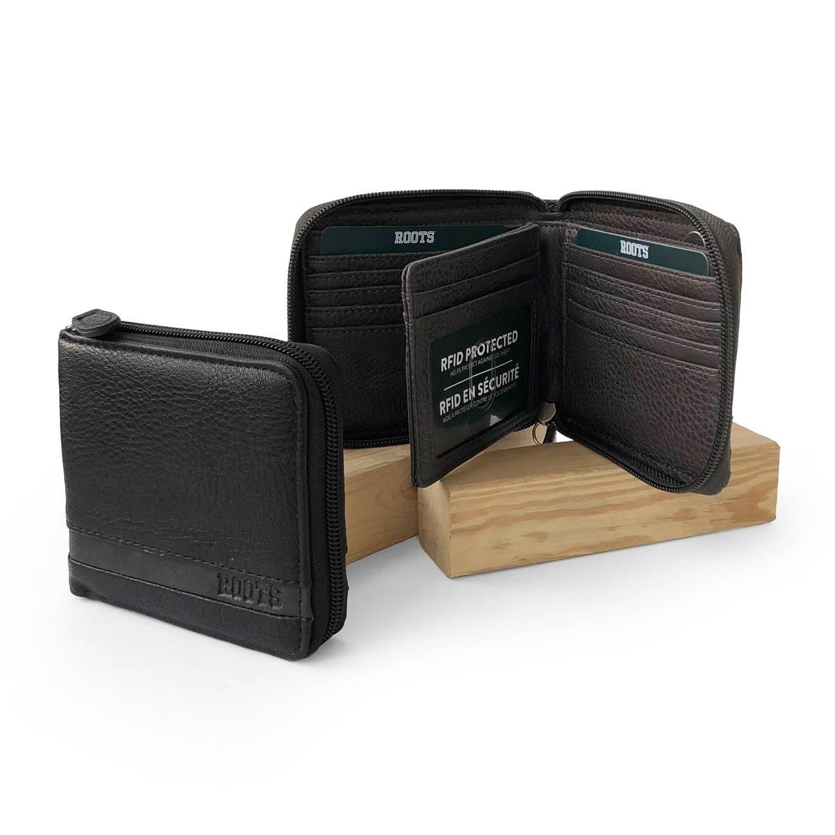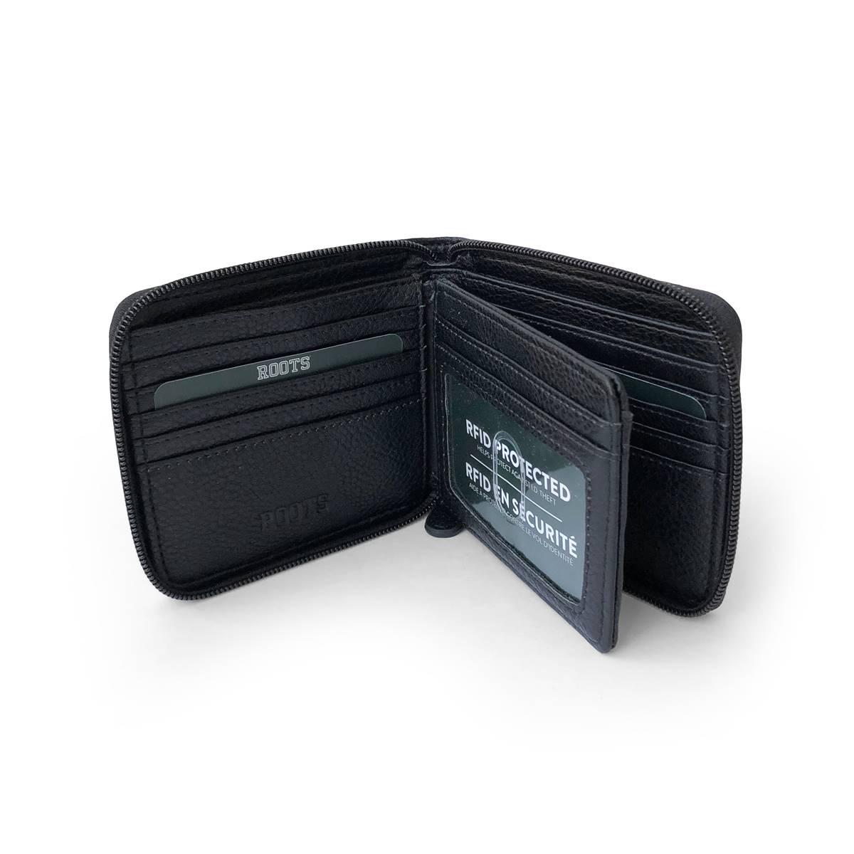 Description This Mens Roots Roughing it Zipper Around Wallet is a great everyday wallet that is designed to keep your cards and cash organized. Includes RFID wave blocking...