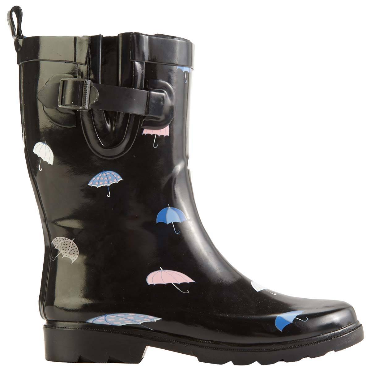 MAke a splash on rainy days wearing these Womens Capelli New York shiny falling umbrellas print mid calf rain boots. Features a buckle, gusset, and back pull loop.